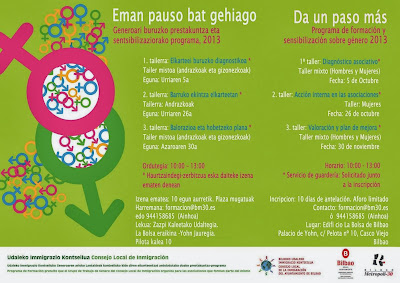 En el marco del Programa de formación y sensibilización sobre género para 2013, «¡Da un paso más!/ Eman pausu bat gehiago!», organizado por el Grupo de Trabajo de Género del Consejo Local de Inmigración, me es muy grato invitarte a participar al TERCER TALLER de este nuevo ciclo orientado a analizar la participación y fomentar el empoderamiento de las mujeres dentro de las asociaciones, la participación paritaria y la toma de decisiones.