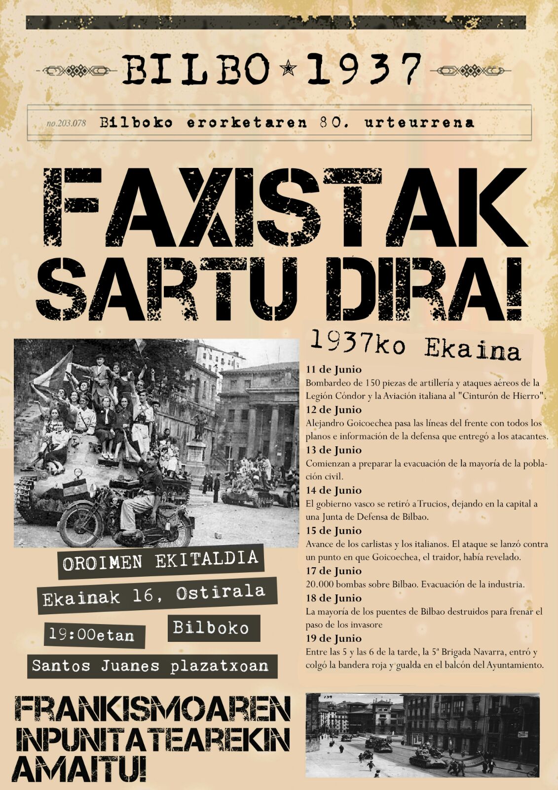 Hace 80 años que las tropas franquistas tomaron Bilbo y Areilza gritó: “Aquí, nada de pactos, sino, ley de Guerra dura. Ha habido, ¡vaya si ha habido!, vencedores y vencidos”. A esto siguieron 40 largos años de implacable y sangrienta Dictadura que reprimió al pueblo vasco y la clase obrera. La llamada Transición no fue de cabio, sino de una transición donde los responsables franquistas se autoindultaron e impusieron la Monarquía y una Constitución de “cierra España”. A partir de ahí, gracias al obligado bipartidismo, ha persistido en otros 30 años el silencio doloso sobre los Crímenes del franquismo.
