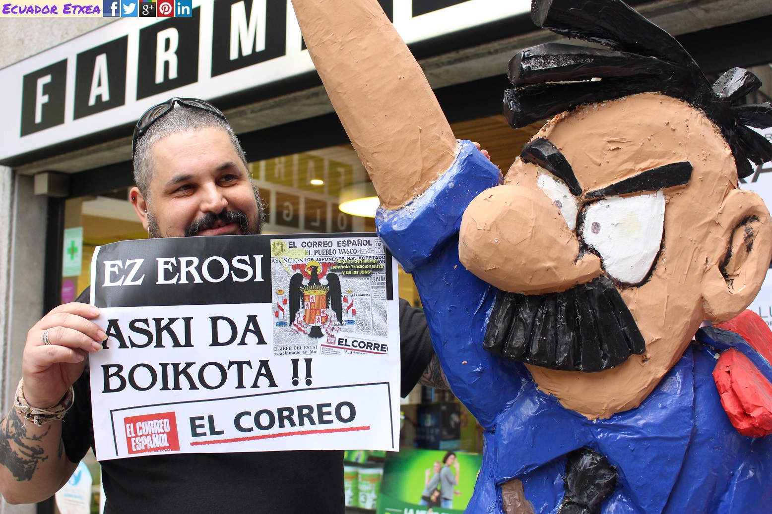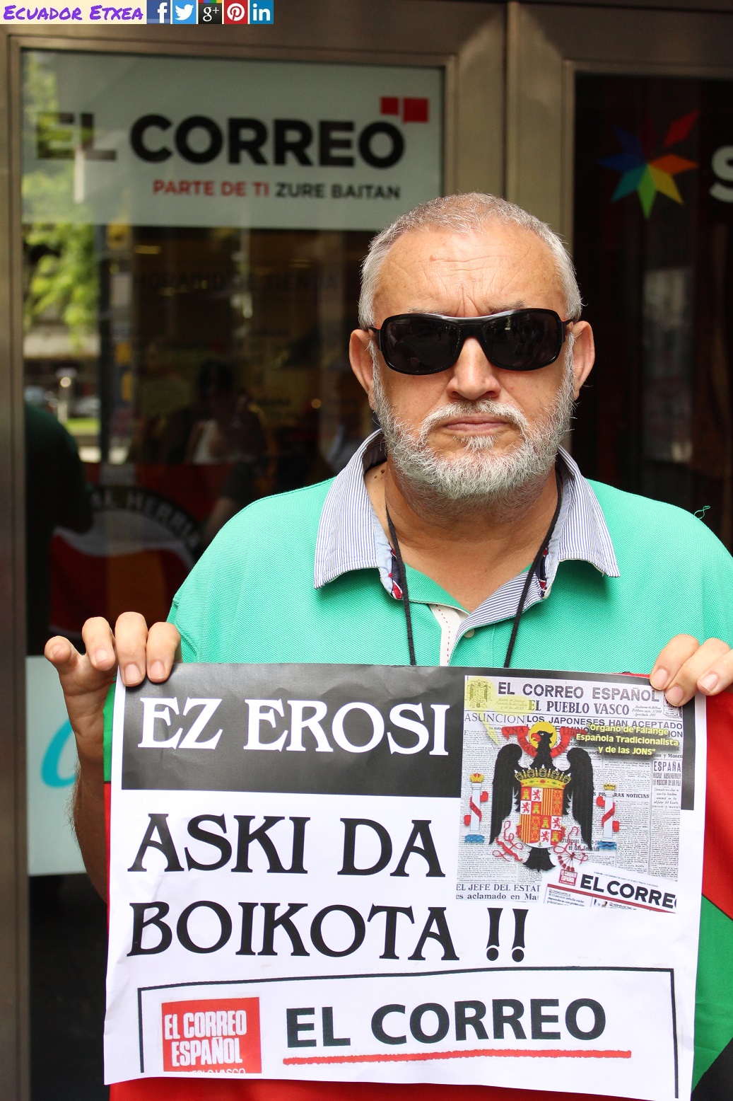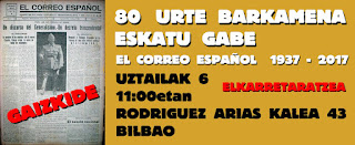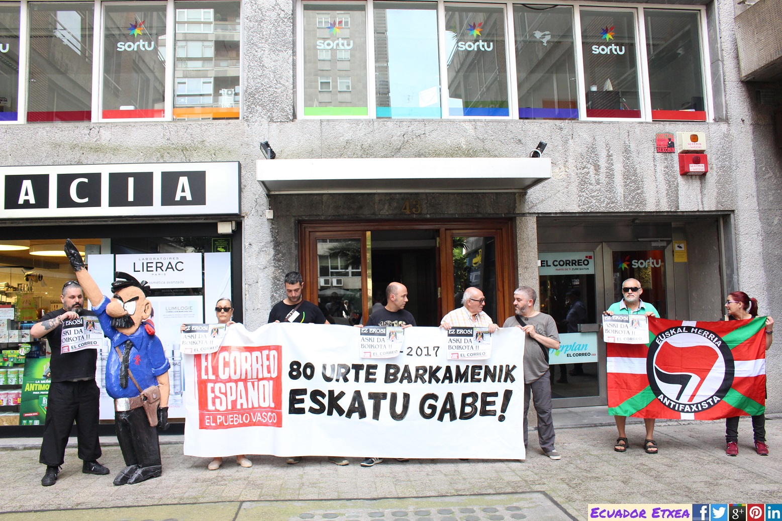 Este jueves 6 de julio de 2017, Sare Antifaxista ha realizado una concentración con motivo del 80 aniversario del primer número publicado por el diario “El Correo Español” fecha en la que se produce la toma de Bilbao por el ejército de Franco, y el nuevo poder instalado en la villa busca por todos los medios imponer la versión de su relato. Entre los medios de comunicación afines al régimen en la villa, están plagados de cientos de artículos que enfocan la toma de Bilbao de acuerdo al criterio del primer alcalde franquista de la villa (Areilza).