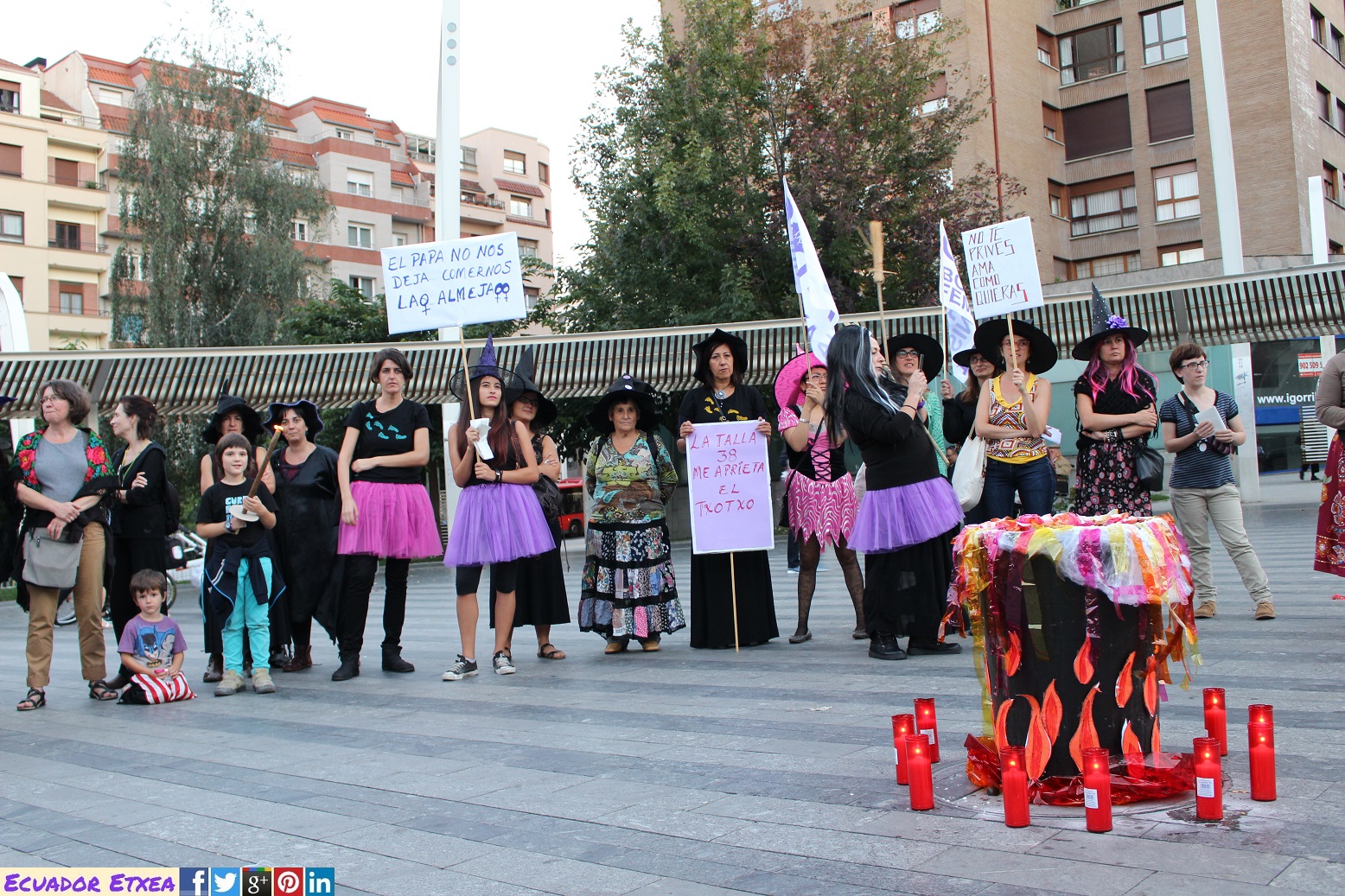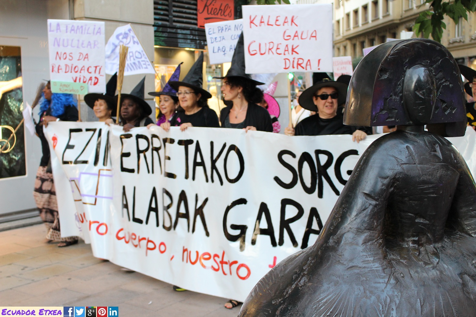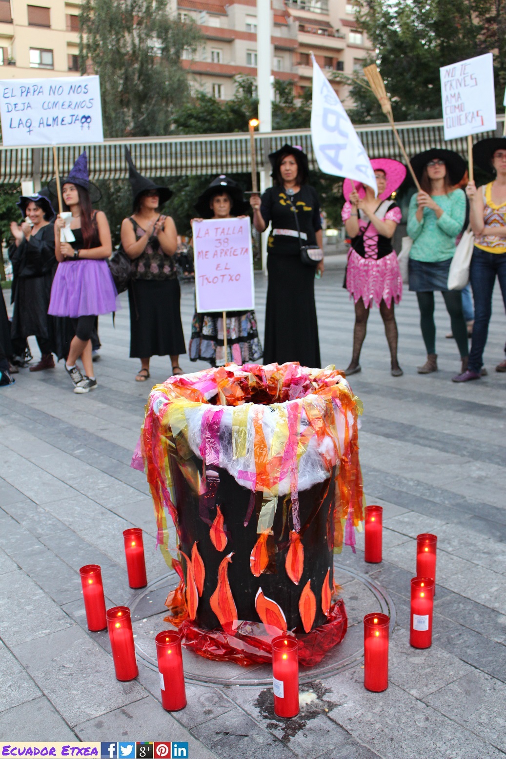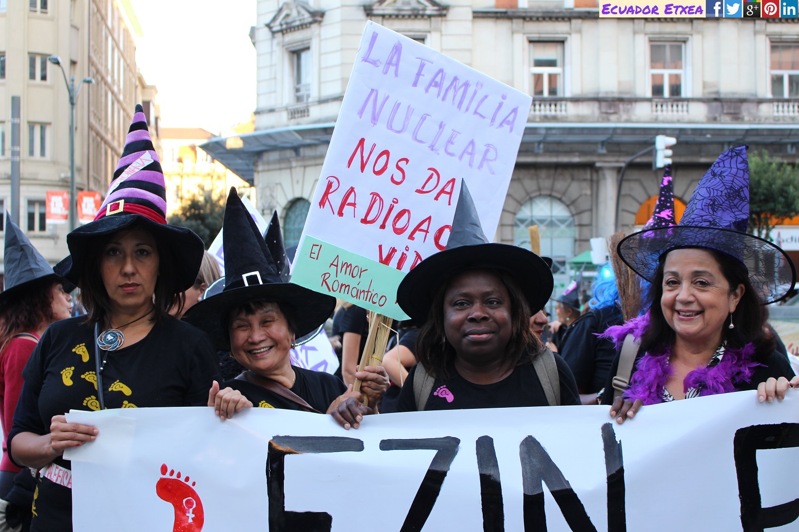 Actividad #2 (en Bilbao) enmarcada dentro de la 4ta acción de la Marcha Mundial de las Mujeres. Kalejira de brujas plurales y diversas (con gorros, pelucas, corsés, crestas), que llega a la Plaza de Indautxu donde se hará un conjuro colectivo y quemarán todo aquello que impone la heteronormatividad, y el sistema capitalista en los cuerpos y sexualidades de las mujeres (maniquíes, crucifijos, leyes, tacones, barbies). El recorrido será: Plaza Circular-Gran Vía-Moyua-Ercilla-Plaza Indautxu.