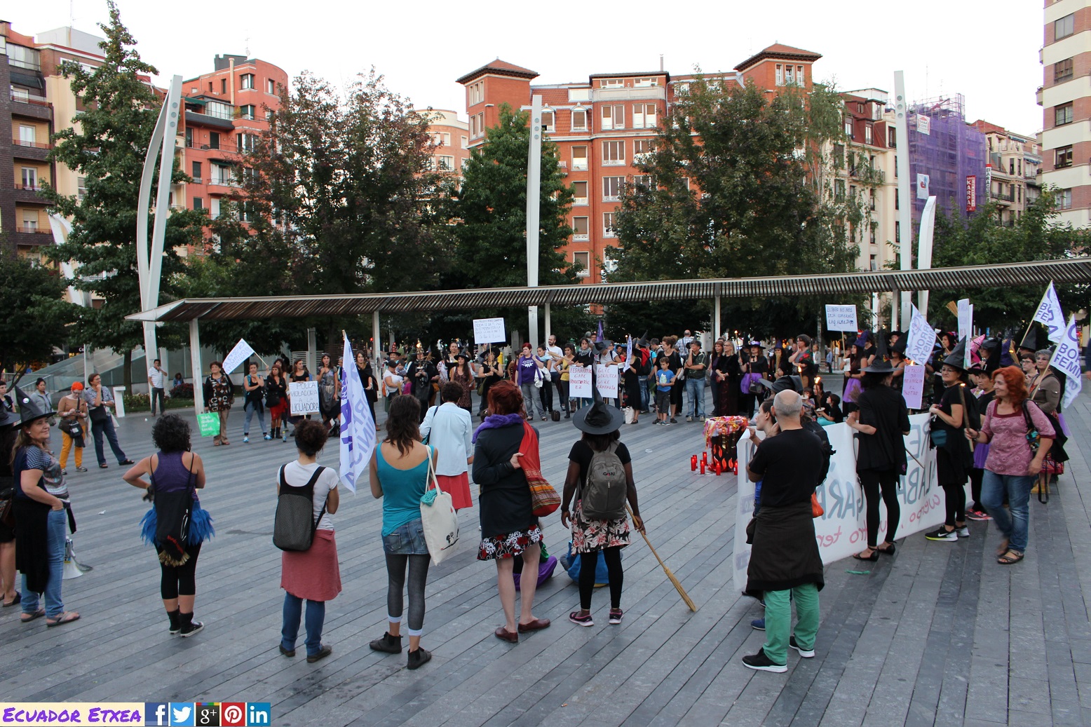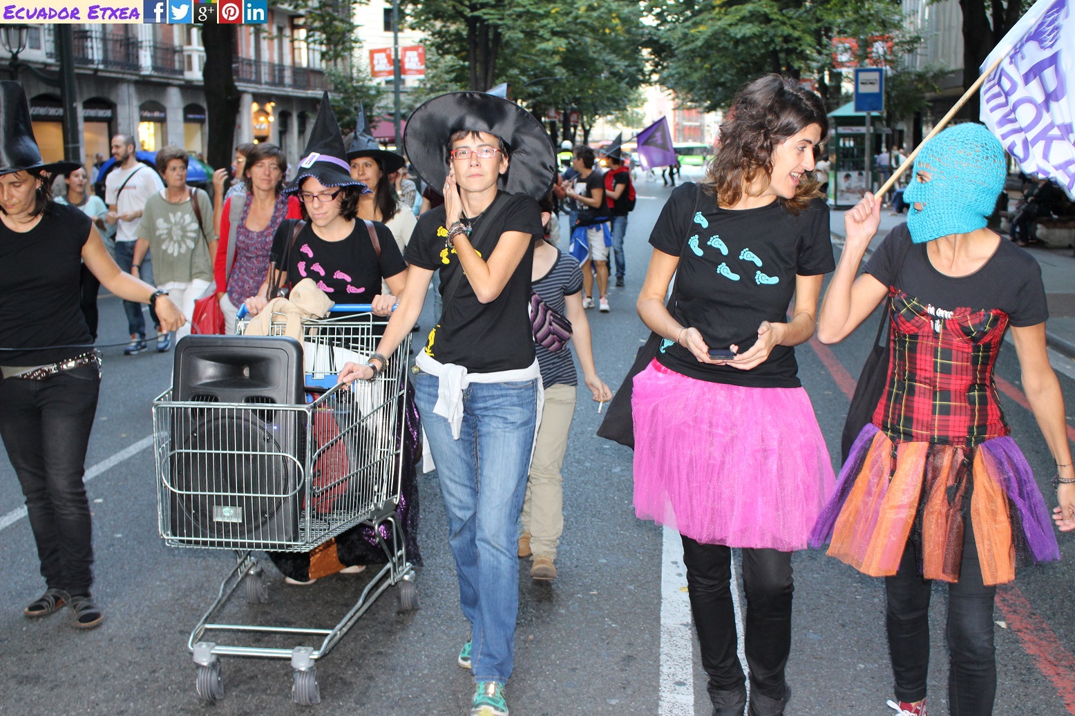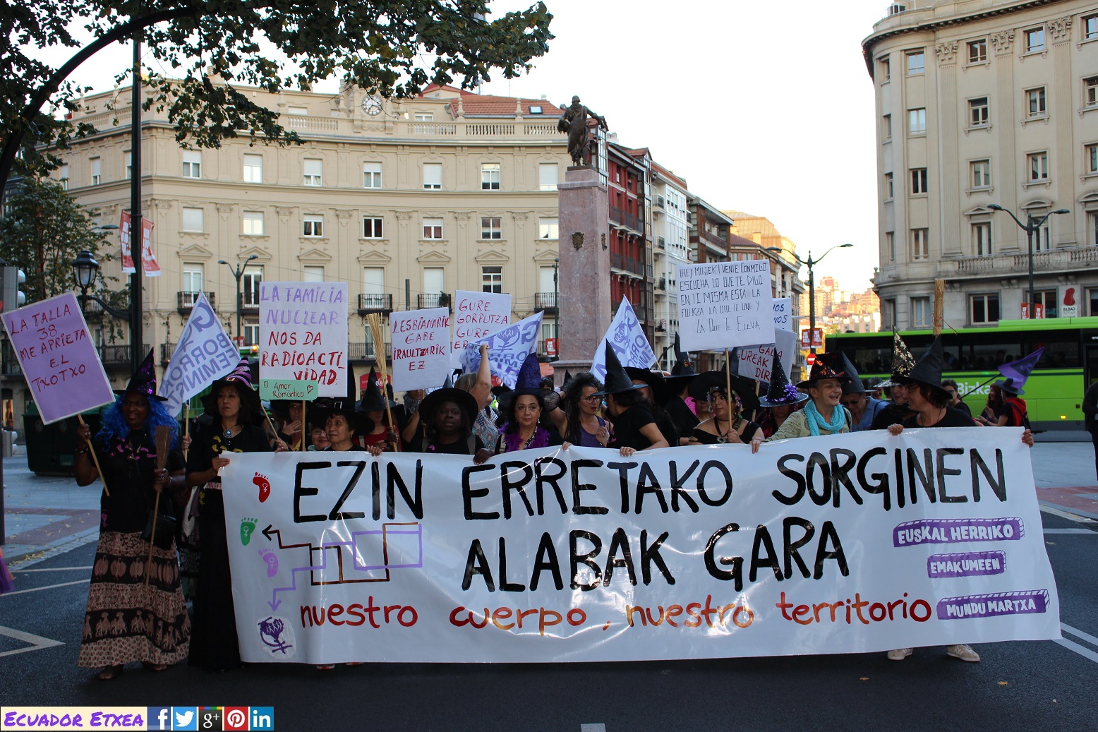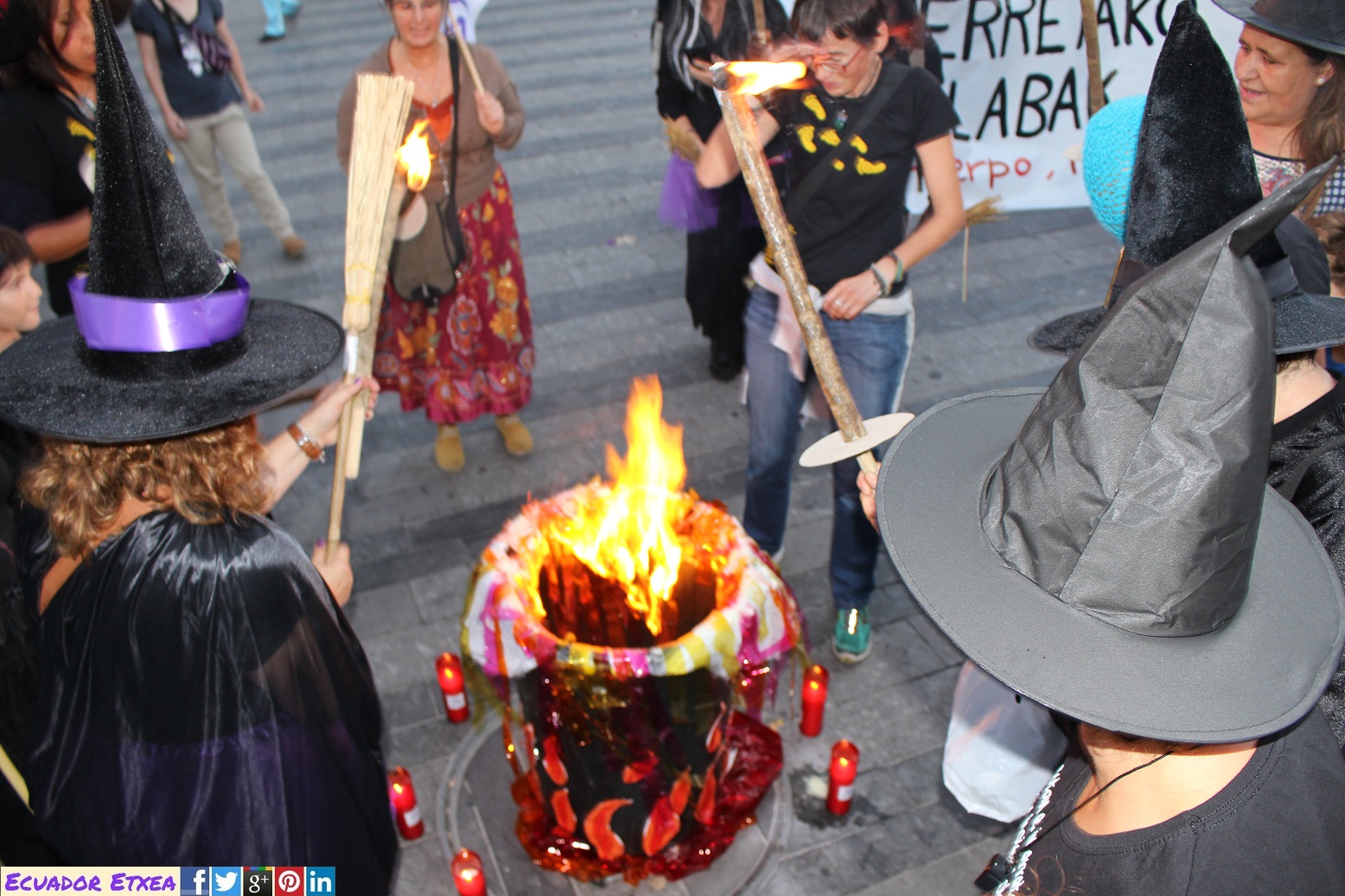 Actividad #2 (en Bilbao) enmarcada dentro de la 4ta acción de la Marcha Mundial de las Mujeres. Kalejira de brujas plurales y diversas (con gorros, pelucas, corsés, crestas), que llega a la Plaza de Indautxu donde se hará un conjuro colectivo y quemarán todo aquello que impone la heteronormatividad, y el sistema capitalista en los cuerpos y sexualidades de las mujeres (maniquíes, crucifijos, leyes, tacones, barbies). El recorrido será: Plaza Circular-Gran Vía-Moyua-Ercilla-Plaza Indautxu.