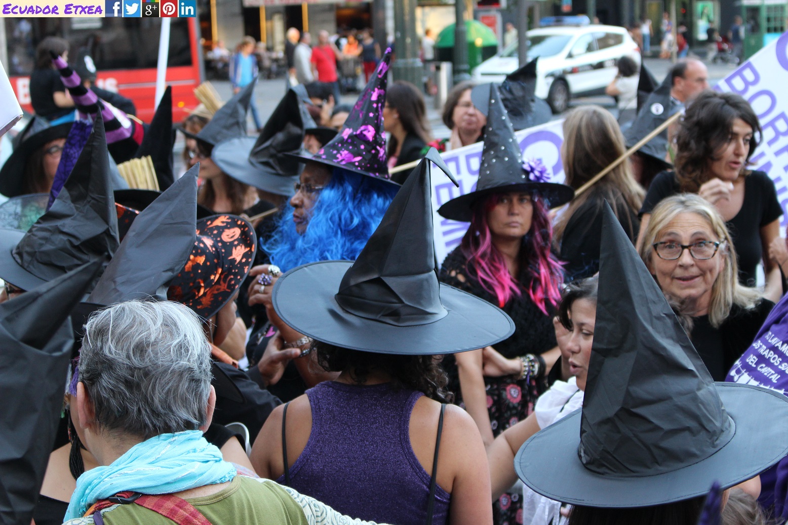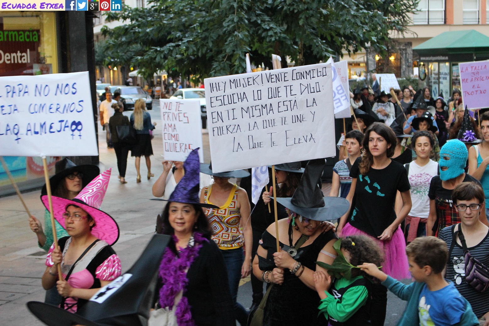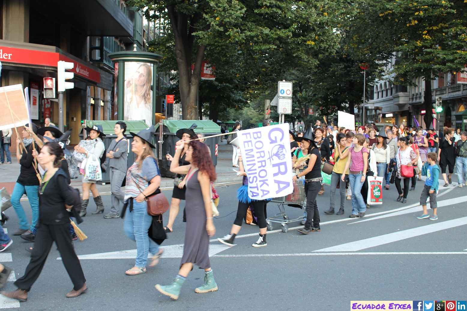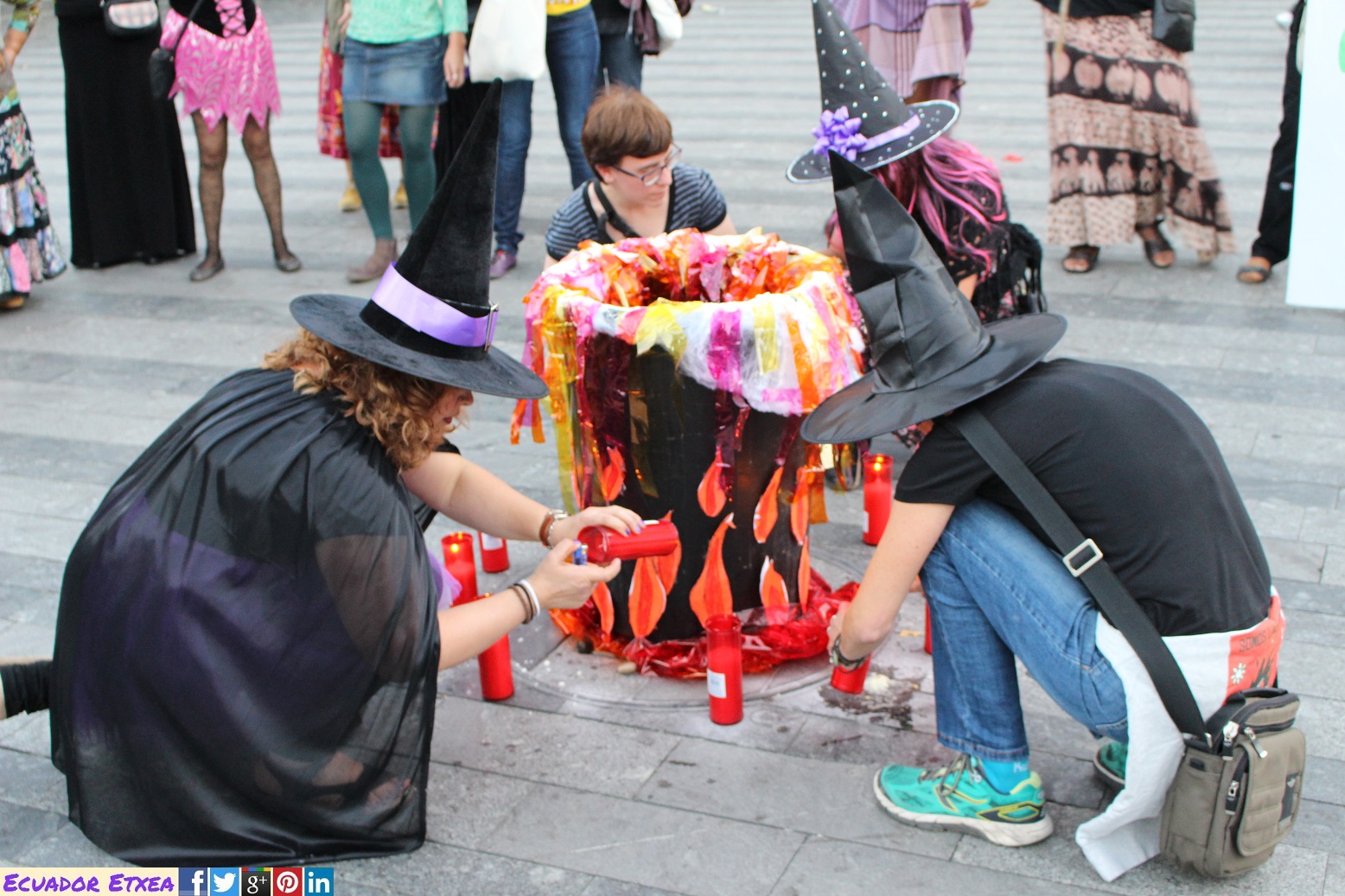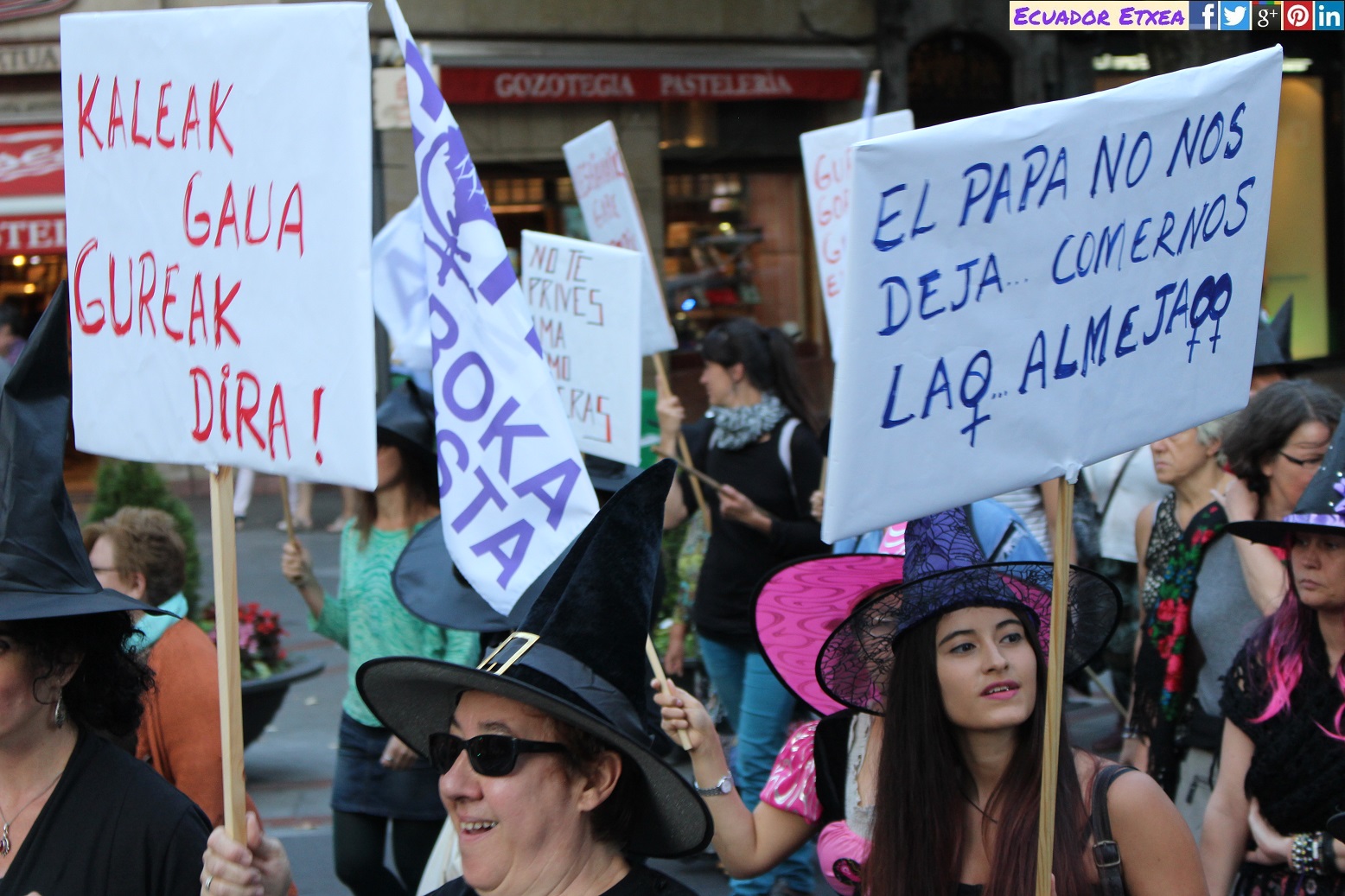 Actividad #2 (en Bilbao) enmarcada dentro de la 4ta acción de la Marcha Mundial de las Mujeres. Kalejira de brujas plurales y diversas (con gorros, pelucas, corsés, crestas), que llega a la Plaza de Indautxu donde se hará un conjuro colectivo y quemarán todo aquello que impone la heteronormatividad, y el sistema capitalista en los cuerpos y sexualidades de las mujeres (maniquíes, crucifijos, leyes, tacones, barbies). El recorrido será: Plaza Circular-Gran Vía-Moyua-Ercilla-Plaza Indautxu.