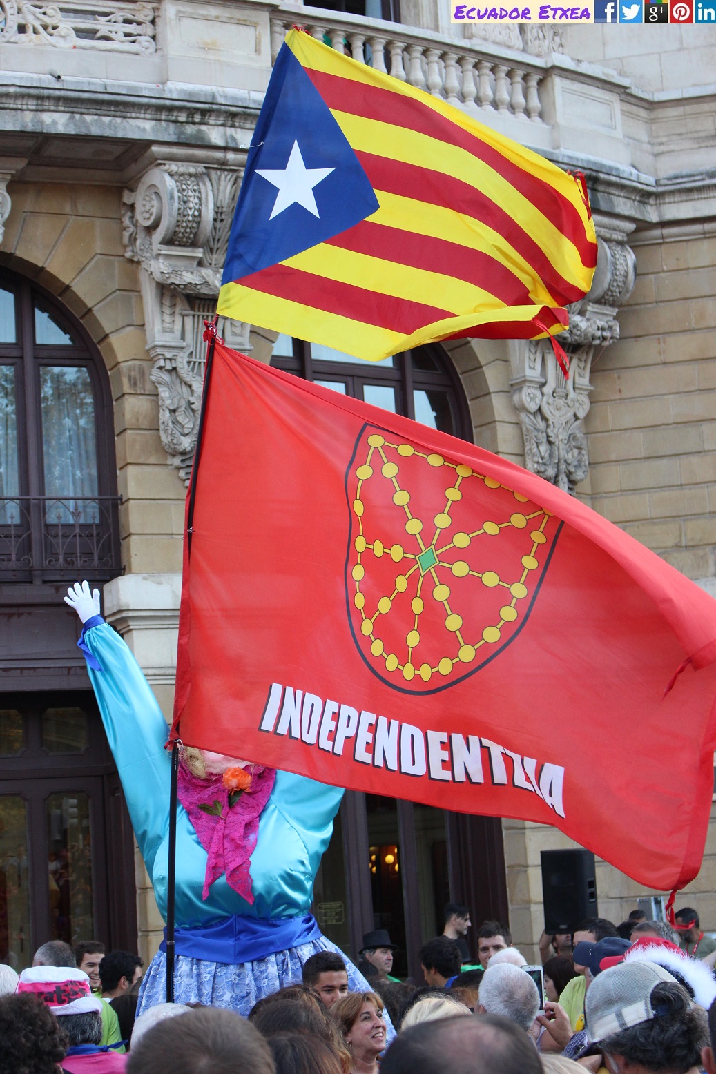Inmediatamente después del estallido del cohete, Marijaia ha aparecido en el balcón con un elegante vestido azul en distintas tonalidades, a juego de una blusa de ese mismo color y un pañuelo rosa. Con su eterna sonrisa y los brazos en alto ha recibido las miles de personas que han abarrotado la plaza del Teatro Arriaga, que tras un año entero sin verla han empezado a jalear al son de la emblemática canción compuesta por Kepa Junkera.