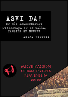 Señalan así mismo que “los vecinos y vecinas de Otxarkoaga queremos que las instituciones pongan solución a esta sensación de inseguridad que actualmente tenemos en el barrio. Somos conscientes de que no es un problema solo de Otxarkoaga, y que en más barrios están sufriendo hechos similares”.