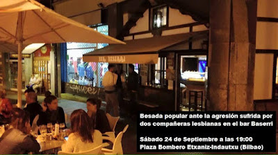 Por ello, ante esta agresión, Sare Lesbianista ha convocado una BESADA POPULAR este sábado 24 de septiembre a las 19:00hrs. en la Plaza del Bombero Etxaniz (Zona Indautxu) para dejar claro que “Ante la lesbofobia, nuestros besos”