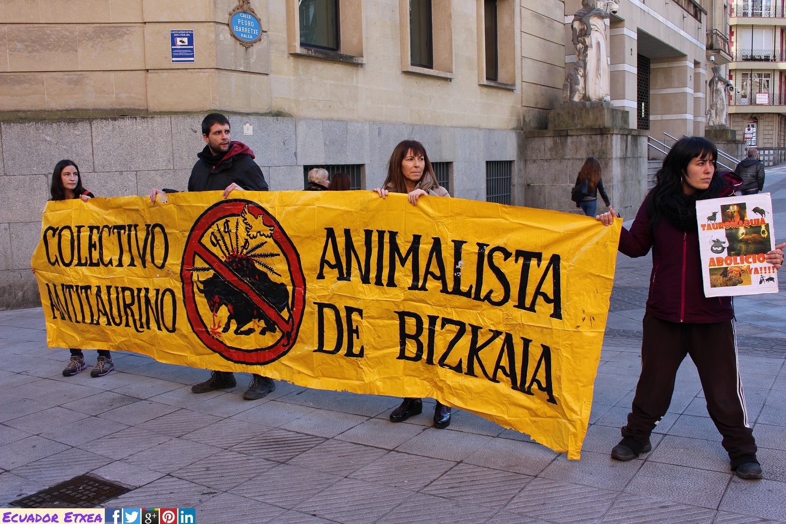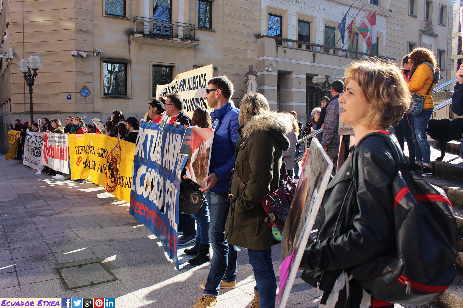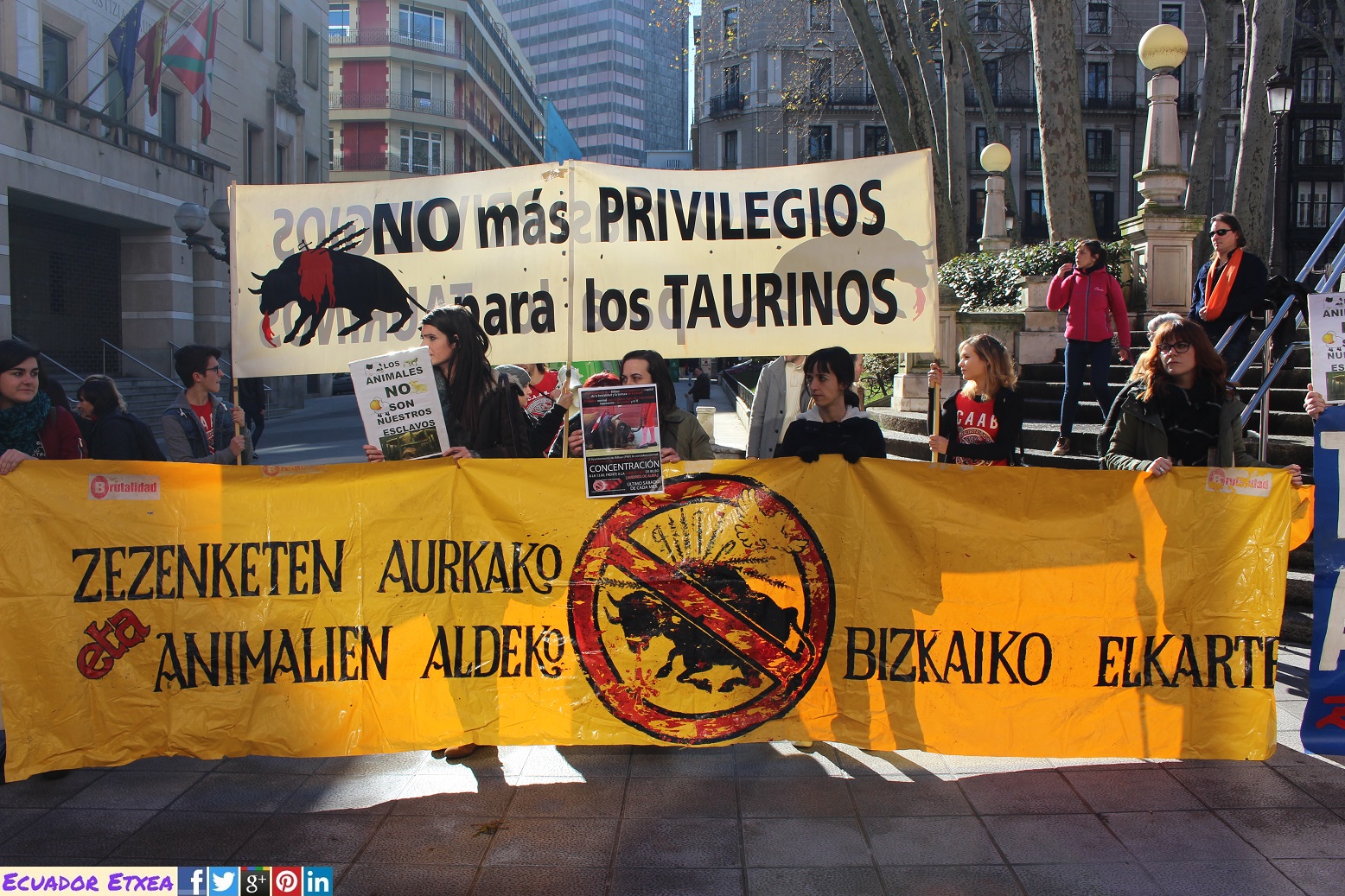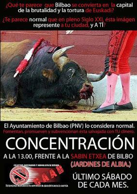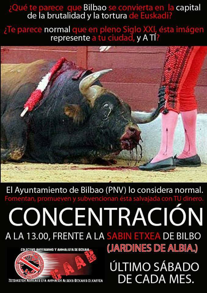 Vitoria-Gasteiz no asesinará toros este verano en sus fiestas, en Donosti cada vez se ve más cercana la convocatoria de un referéndum que elimine las corridas de toros y mientras tanto en Bilbao, con alcalde y un gobierno del mismo partido político que nuestros vecinos, se empeñan en un inmovilismo político, que en nada tiene que ver con el sentimiento ciudadano y que sólo pretende blindar un espectáculo que a los bilbaínos nos avergüenza. Por todo ello el Colectivo Antitaurino Animalista de Bizkaia, hemos realizado una concentración este sábado 28 de enero de 2017 a las 13:00hrs. y seguiremos realizando concentraciones cada último sábado de mes, frente a la sede del PNV (Jardines de Albia), para exigir que el maltrato a los animales y la muerte de inocentes toros sea desterrada de nuestra ciudad.