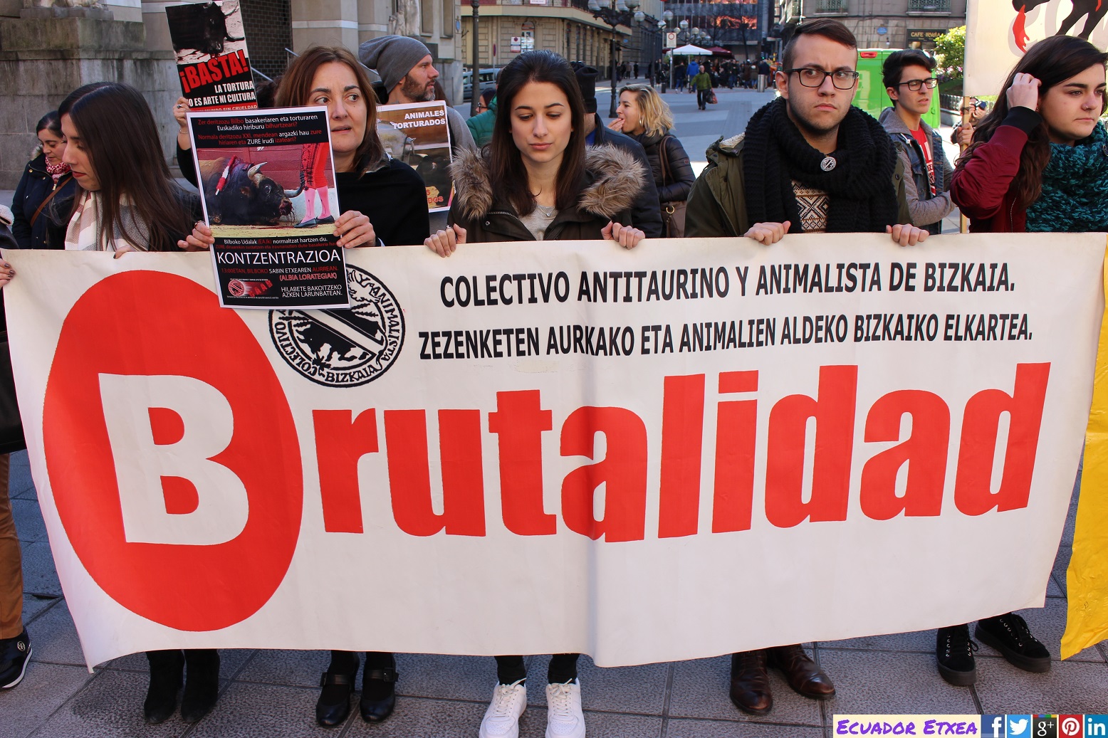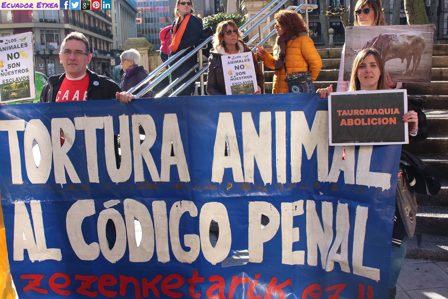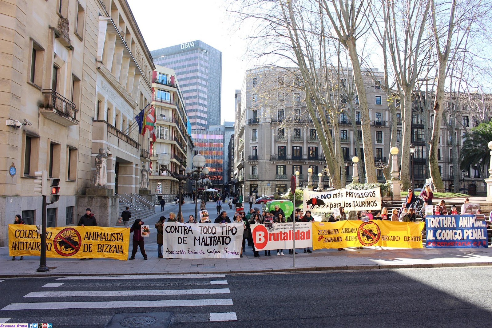 Vitoria-Gasteiz no asesinará toros este verano en sus fiestas, en Donosti cada vez se ve más cercana la convocatoria de un referéndum que elimine las corridas de toros y mientras tanto en Bilbao, con alcalde y un gobierno del mismo partido político que nuestros vecinos, se empeñan en un inmovilismo político, que en nada tiene que ver con el sentimiento ciudadano y que sólo pretende blindar un espectáculo que a los bilbaínos nos avergüenza. Por todo ello el Colectivo Antitaurino Animalista de Bizkaia, hemos realizado una concentración este sábado 28 de enero de 2017 a las 13:00hrs. y seguiremos realizando concentraciones cada último sábado de mes, frente a la sede del PNV (Jardines de Albia), para exigir que el maltrato a los animales y la muerte de inocentes toros sea desterrada de nuestra ciudad.
