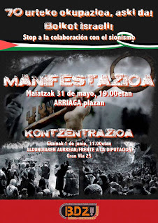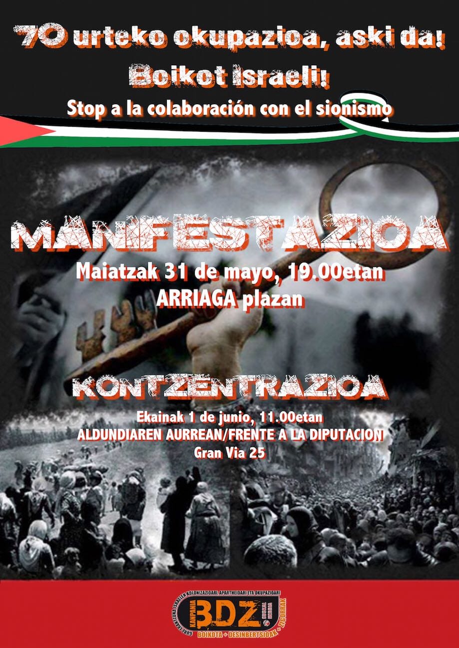 Centenares de personas y colectivos que pertenecen y/o apoyan la campaña de Boikot a Israel BDS Bizkaia BDZ, han participado en una manifestación que ha recorrido las calles de Bilbao, desde la plaza del teatro Arriaga hasta finalizar frente al Palacio de la Diputación Foral de Bizkaia para denunciar por una parte, la masacre cometida por el estado de Israel en Gaza estas últimas semanas; y por otra, denunciar el convenio que recientemente ha firmado la Diputación Foral de Bizkaia con la empresa israelí SOSA. Y para dejar claro su rechazo, se realizará la entrega de una carta dirigida a Unai Rementeria este viernes 1 de junio a las 11:00h. en la misma Diputación.