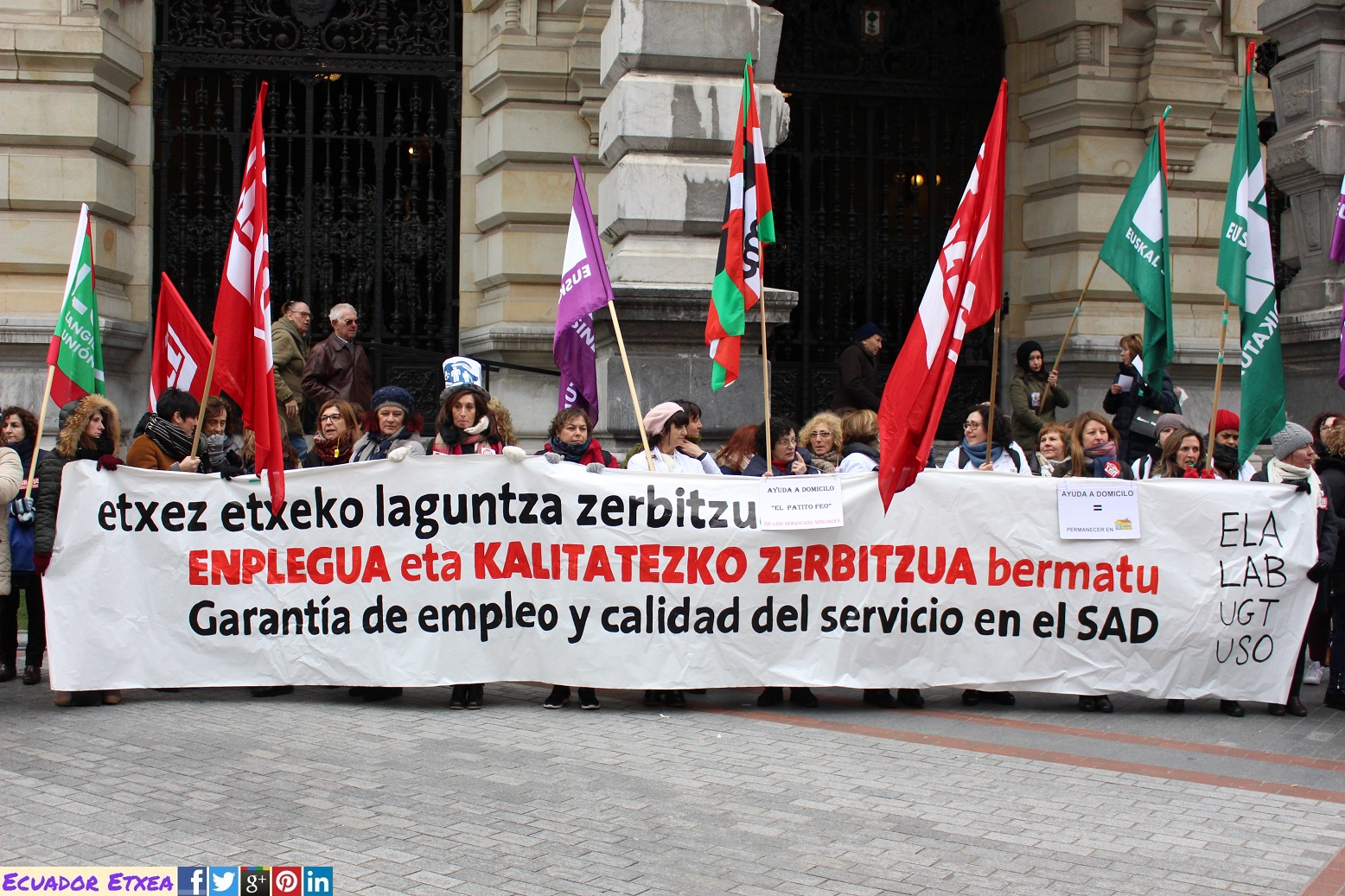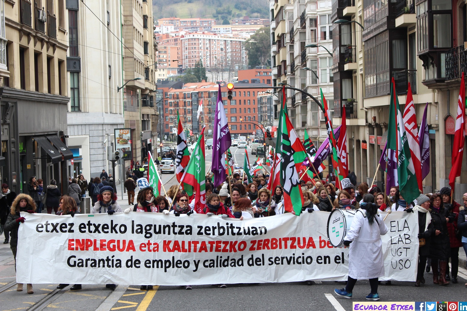 En manifestación convocada por los sindicatos ELA–LAB–UGT y USO, han unido el Ayuntamiento de Bilbao con la Diputación Foral de Bizkaia en defensa de sus condiciones de trabajo. Bajo el lema, “Garantía de empleo y calidad del servicio en el SAD”, las trabajadoras han tomado las calles de Bilbao para exigir un cambio radical en la gestión del servicio.