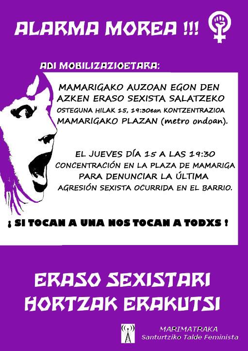 Queremos denunciar la última agresión sexista que ha sufrido el barrio de Mamariga. Tenemos claro que cada vez que una de nosotras es agredida todxs somos agredidxs, y es por eso que no podemos entender las agresiones más que de forma colectiva. Estamos hartas de que formen parte de nuestra vida diaria, consecuencia de este sistema patriarcal.