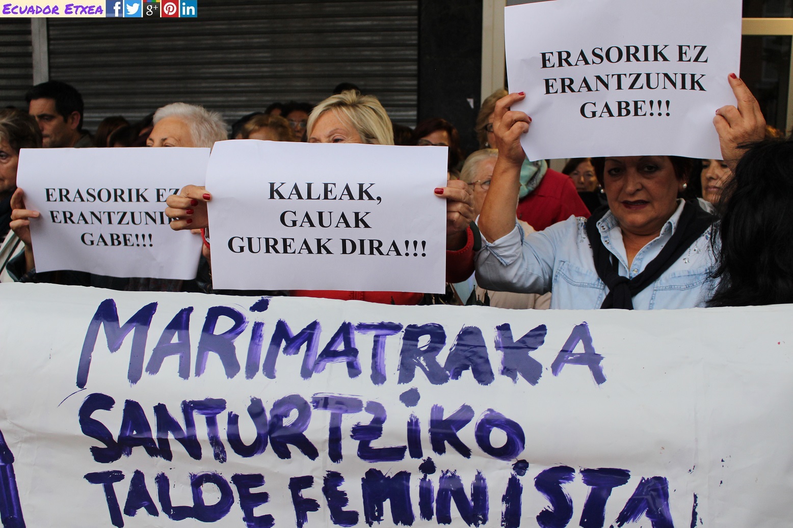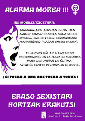 Son muchos los ejemplos: nos agreden y hospitalizan en las calles de Miribilla, nos rodean en las jaias de Bilbo, nos agreden con palabras, con actitudes, y nos roban nuestro espacio. Son muchos los sitios, muchas las situaciones, y muchos los casos, y ante todos ellos nos tendrán en frente. Aquí estamos cuando se denuncia, cuando no se denuncia, cuando nos enfrentamos a cualquier agresión en nuestro día a día. Nos tendrán en frente porque hemos decidido tener una vida en libertad y con dignidad. GORA BORROKA FEMINISTA!!!