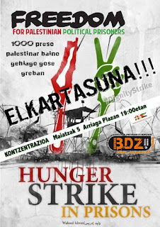 Este viernes 5 de mayo en Bilbao, la BDZ Bizkaia ha realizado una concentración por la libertad y dignidad de más de 1.600 presos palestinos que se encuentran en huelga de hambre desde el 17 de abril en la cárcel Ofer de Israel, y en contra de las condiciones a las que son sometidos. De hecho, este lunes pasado, Mazan al Maghrebi, un joven palestino de 30 años de edad, falleció de una enfermedad renal tras participar en la huelga, convirtiéndose en la primera víctima.