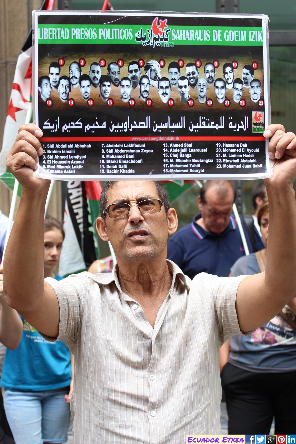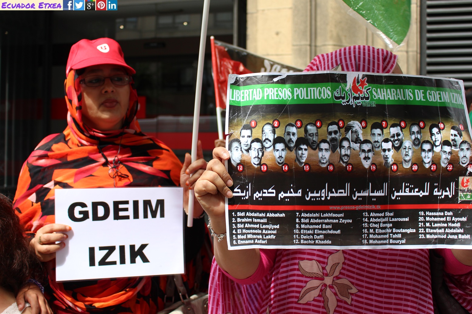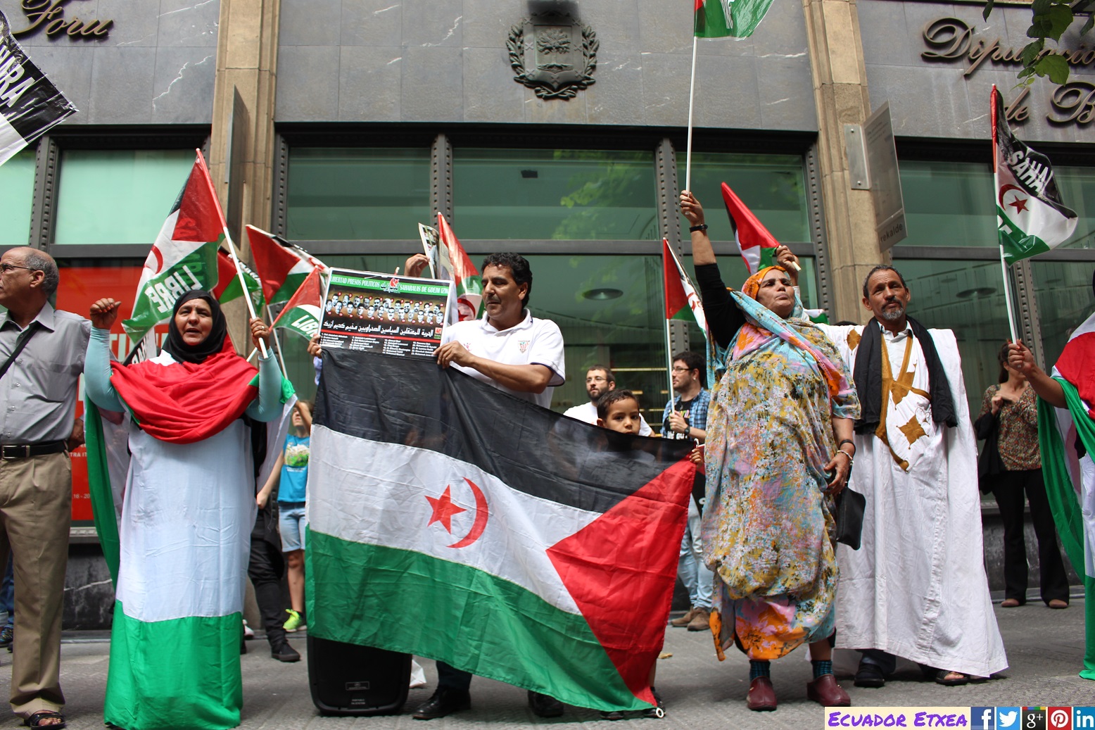 Este martes día 11 de Julio, la Diáspora Saharahui en Bizkai (DISABI), junto a diferentes asociaciones, sindicatos y partidos políticos vascos, han realizado una concentración frente al consulado de Marruecos en Bilbao (C/Alameda de Rekalde, 27) para protestar por el juicio reiniciado en Rabat (Marruecos) contra los presos políticos de Gdeim Izik. El juicio contra los 24 activistas saharauis detenidos y encarcelados que tras el desmantelamiento del campamento de la dignidad en 2010 podría estar cerca de su etapa final.