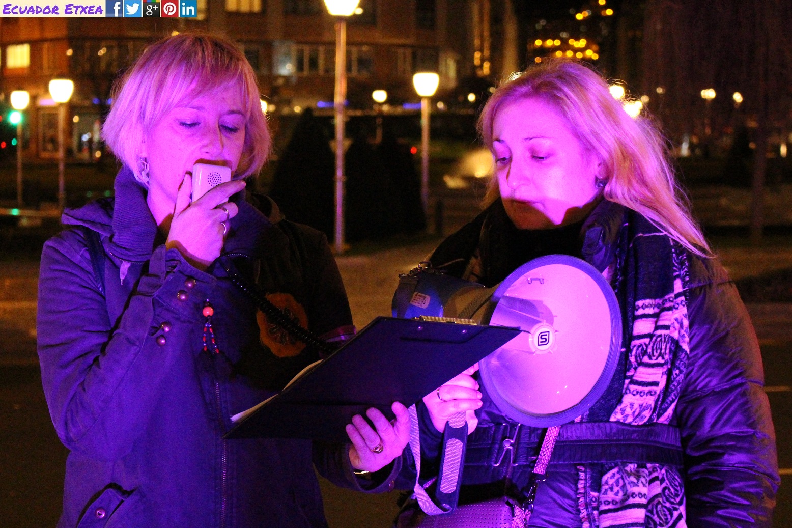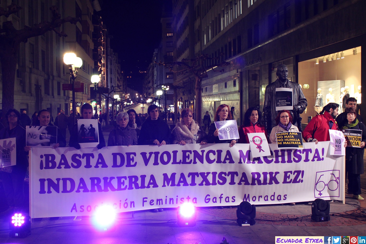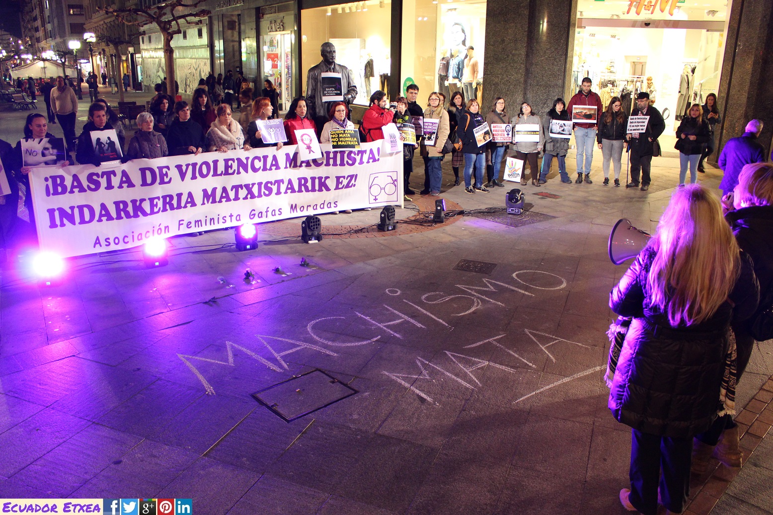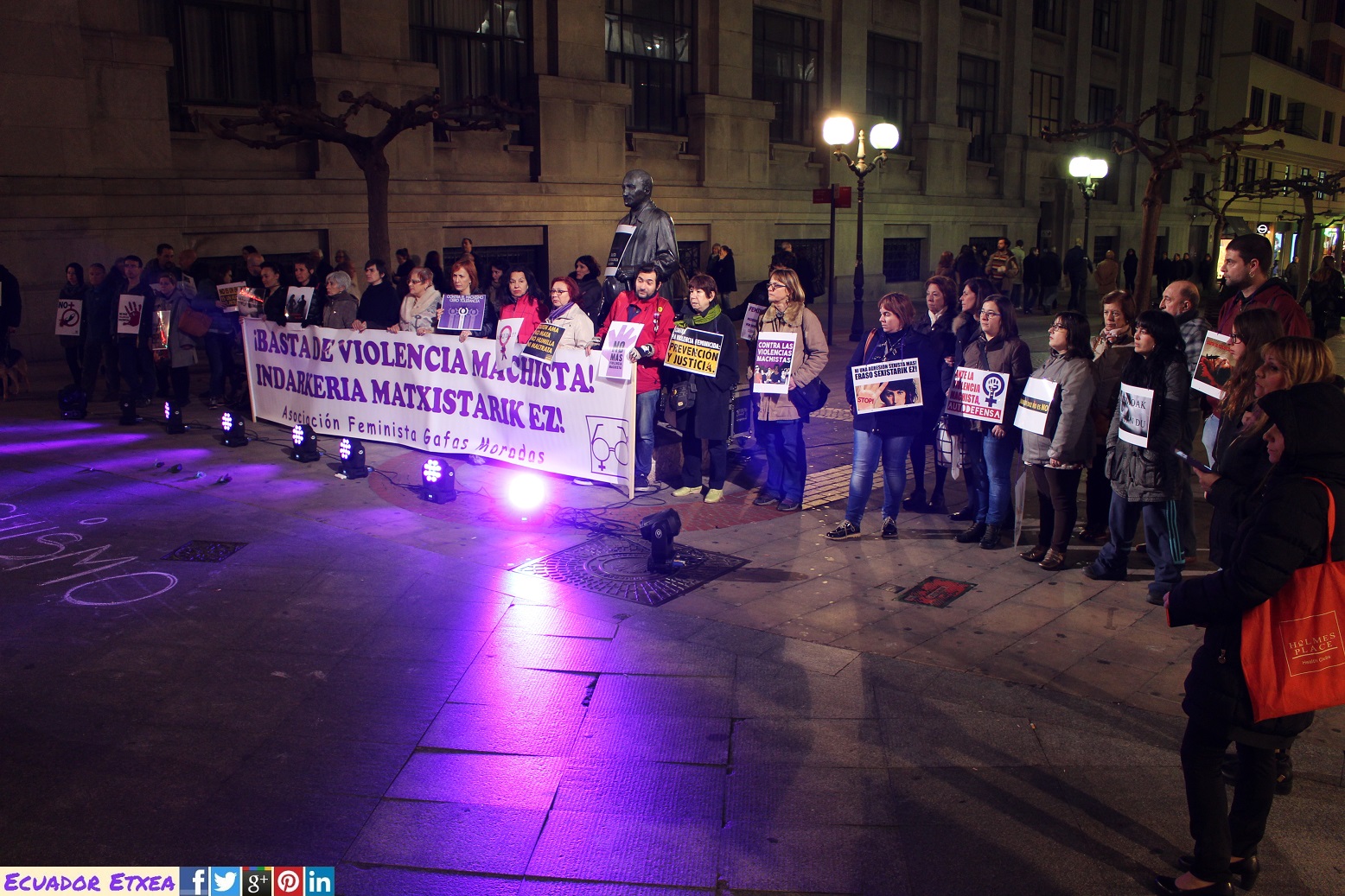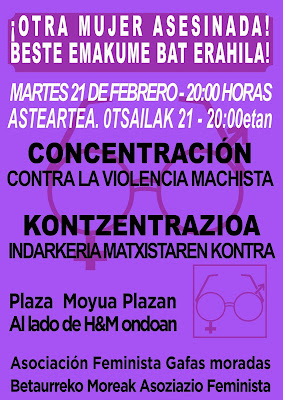 Este martes 21 de febrero la asociación feminista “Gafas Moradas” ha realizado una concentración contra la Violencia Machista por el asesinato de otras 2 mujeres. El primer asesinato se produjo este pasado domingo en el que una mujer de 79 años fue asesinada por su esposo de 86 años en una residencia de la 3º edad en Alicante. http://bit.ly/2mbIuIq Al día siguiente conocimos la noticia de una explosión en una vivienda de Redondela (Pontevedra) en la que murieron una mujer de 50 años y su expareja (hombre). Las investigaciones policiales y la Delegación del Gobierno en Galicia han confirmado que tanto la explosión como el consiguiente incendio fueron intencionados ya que las pruebas demuestran que el hombre manipuló dos bombonas de butano y utilizó un bidón de gasolina para potenciar la explosión. Por lo tanto, estamos ante otro nuevo caso de un crimen machista. http://bit.ly/2miH9jg