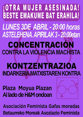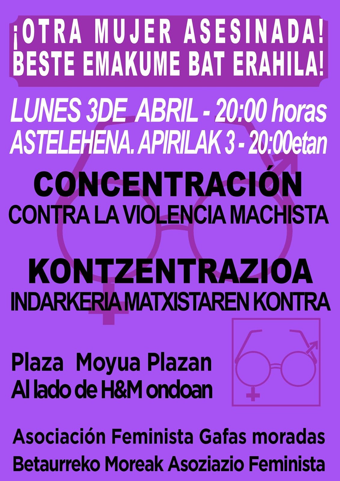 La asociación feminista “Gafas Moradas” ha realizado una concentración este lunes 3 de abril en Bilbao, por el asesinato de Yurena L., de 23 años de edad, una mujer que fue estrangulada por su pareja, un hombre de 34 años, en Lomo Magullo (Islas Canarias). Tras cometer el asesinato, el hombre, con quien la víctima mantenía una relación sentimental, intentó ocultar el cuerpo sin vida de su pareja trasladándolo hacia otra parte de la explotación agraria en el maletero de su propio coche, un turismo de color blanco. El asesino se encuentra detenido en las dependencias policiales de Telde, a la espera de pasar a disposición judicial. (Fuente: Teleactualidad) #TerrorismoMachista