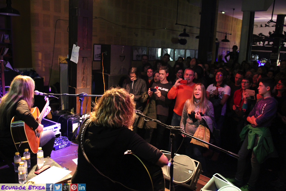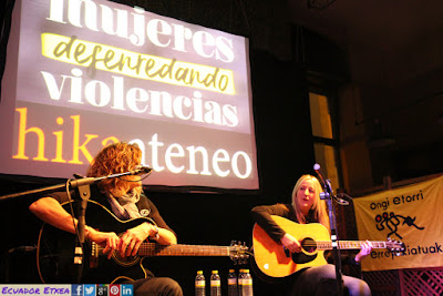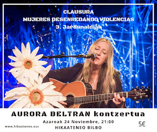 Como cierre de las terceras Jornadas “Mujeres Desenredando Violencias”, organizadas por la Asociación para la reflexión y el debate Hikaateneo y en las que colaboran: Medicus Mundi Bizkaia + Skolastika + Ecuador Etxea + Ayto. Cornellá + Mugarik Gabe + Mundo Ivaginario + DOKTTORE- Doktoregaien sare feminista + FeministAlde! + Pikara Magazine + Mundubat, este viernes 24 de noviembre, en el Hika Ateneo de Bilbao se realizó el concierto de Aurora Beltrán, referente de mujer combativa y emotiva quien a los 13 años compuso su primera canción. A mediados de los años 1980 comienza su andadura musical como guitarrista del grupo navarro Belladona, que tras grabar un elepé, Las mujeres y los negros primero, se disuelve. En 1987 forma en Pamplona, junto a su hermano Lolo y dos viejos conocidos, el grupo Tahúres Zurdos.