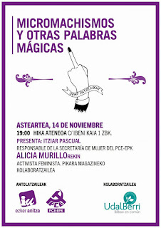 Decenas de personas se han dado cita este martes 14 de noviembre en el Hika Ateneo de Bilbao, para escuchar la conferencia: Micromachismos y otras palabras mágicas, impartida por Alicia Murillo, y organizada por Ezker Anitza-IU.