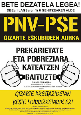 Personas perceptoras de los subsidios de Lanbide, colectivos sociales que trabajan contra la extensión de las situaciones de precariedad, desahucios y pobreza; junto a diferentes agentes sindicales comparecen de forma pública ante la Delegación del Gobierno Vasco en Bilbao para manifestar su hartazgo ante las políticas de recortes aplicadas durante estos últimos años desde el Gobierno Vasco.