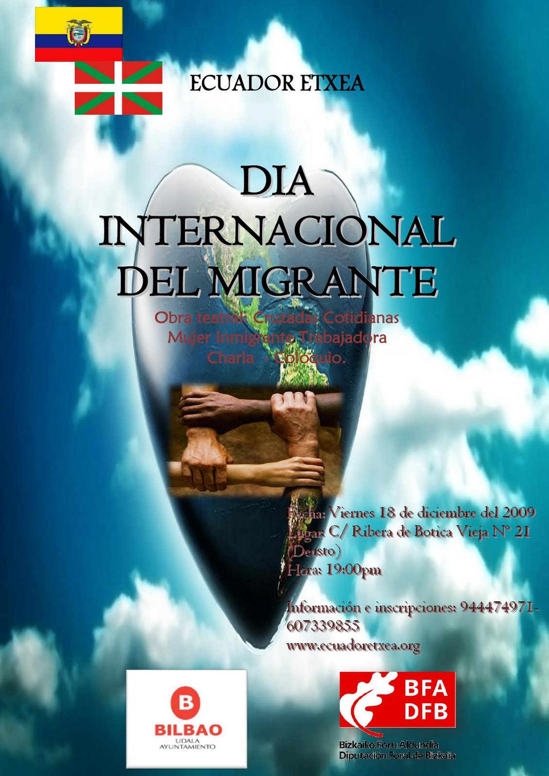 El día viernes 18 de diciembre de 2009 se celebró en la sede de Ecuador Etxea Bilbao el Día Internacional del y la Migrante con la Obra de Teatro «Cruzadas Cotidianas» (Cristina Castillo).