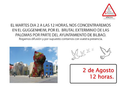La empresa contratada por el ayuntamiento de Bilbao para capturar a las palomas (Perrera de Artxanda), utiliza una jaula no selectiva para cazarlas. El pasado día 18 de julio, la temperatura en Bilbao llegó hasta los 42ºC, este fue uno de los días escogidos por esta empresa para capturar a las palomas en las inmediaciones del museo Guggenheim.