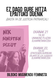 Emakumeen* kontrako indarkeriaren gaitzespenean gizartea inplikatuko duten erantzun sendoak ematen jarraitu behar dugu, eta horregatik, bihar, ekainak 22, 19:00 etan epaitegien aurrean elkartzeko deialdia luzatzen dugu.
