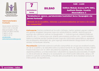 Seminario sobre la custodia compartida en el que se analizará el estado de la cuestión y se debatirá sobre el posicionamiento de agentes sociales. Habrá mesas redondas con la visión de personas expertas. La mesa redonda tratará los aspectos jurídicos. La mesa redonda 2 abordará los aspectos psicosociales. El objetivo de la jornada es ofrecer a la ciudadanía una información relevante, veraz y útil sobre la custodia compartida, a través del conocimiento de la realidad actual y el intercambio de experiencias.