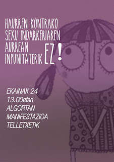 Mediante una rueda de prensa realizada en la Ekoetxea de Bilbao, el Movimiento Feminista ha dado a conocer la convocatoria a una manifestación bajo el lema “¡Contra la violencia sexual en la Infancia, IMPUNIDAD CERO!”, la cual tendrá lugar el próximo día domingo 24 de junio a las 13:00 horas desde la Plaza Telletxe en Algorta, con el objetivo de denunciar la violencia sexual cometida hacia menores de edad.