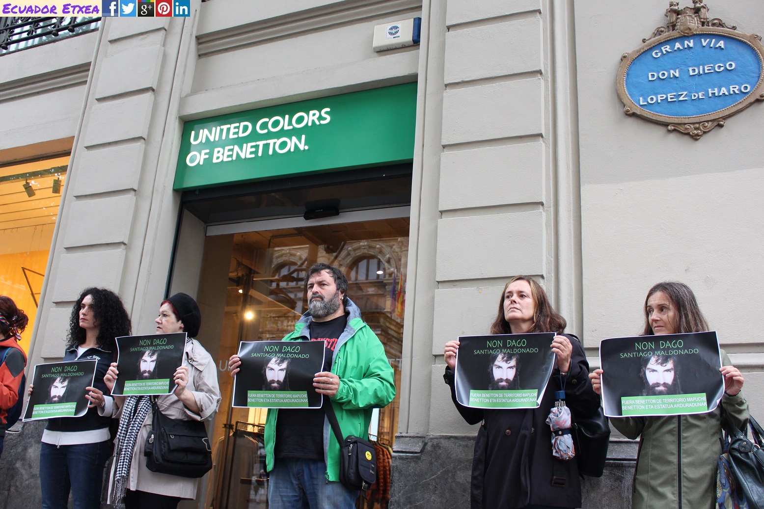 La mañana de este sábado 30 de septiembre, una decena de personas se han concentrado frente a la tiende de Benetton en Bilbao convocados por Wallmapu Euskal Herria, Komite Internazionalistak, Mujeres del Mundo, para denunciar la represión de las autoridades chilenas hacia el pueblo mapuche en la que han sido detenidos 8 dirigentes acusados de cometer incendios y actos delictivos cuando solo están defendiendo sus territorios de empresas multinacionales. Consecuencia de estas detenciones fue la desaparición de Santiago Maldonado durante el mes de agosto pasado en el marco de una protesta reprimida por la Gendarmería Argentina.