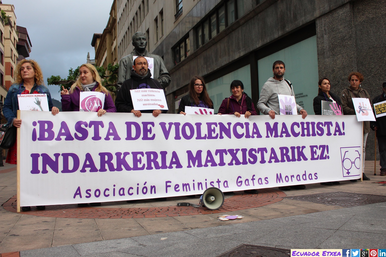 Este lunes 4 de junio, integrantes de la Asociación Feminista “Gafas Moradas” se han concentrado frente a la Plaza Moyúa en Bilbao, para homenajear y dar visibilidad a las mujeres que han sido asesinadas durante este último mes. Y se volverán a movilizar en el mismo lugar, el primer lunes de cada mes hasta que tomemos conciencia de una vez como sociedad de que el Machismo Mata y que tenemos que dejar de ser indiferente ante esta sangría y empezar a luchar por cambiar esta situación insostenible.