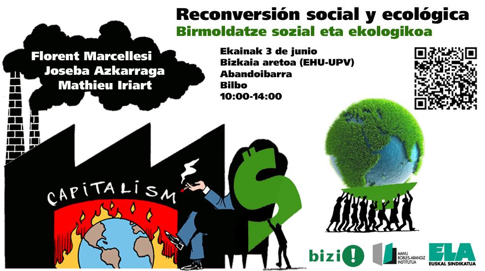 El 3 de junio hemos organizado una jornada sobre la Reconversión social y ecológica. Participarán en la jornada Florent Marcellesi (investigador ecologista), Joseba Azkarraga Etxagibel (soziologo de Lanki) y Mathieu Iriart (activista de Bizi!). La jornada tendrá lugar de 10:00 a 14:00 en el paraninfo de la UPV de Bilbao (Abandoibarra). ¿Cómo y hacia dónde queremos construir esta transición que estamos viviendo?