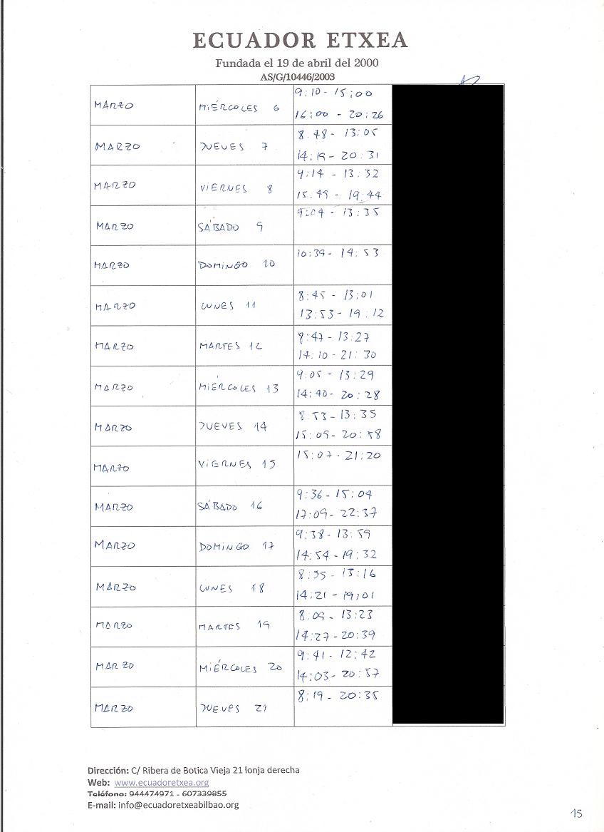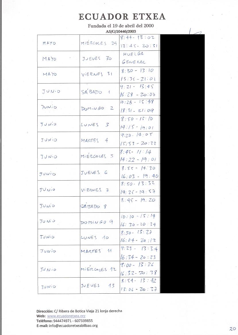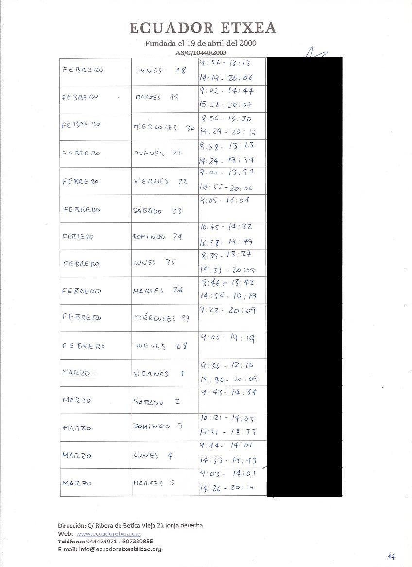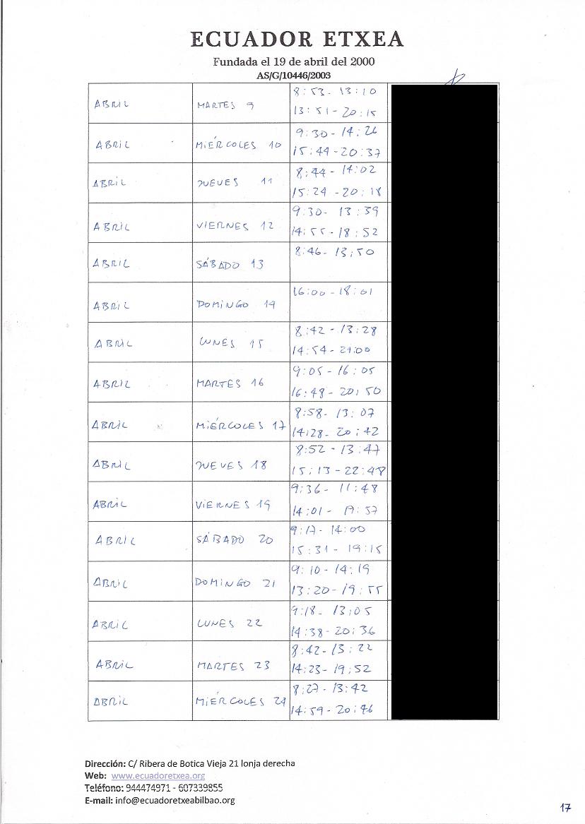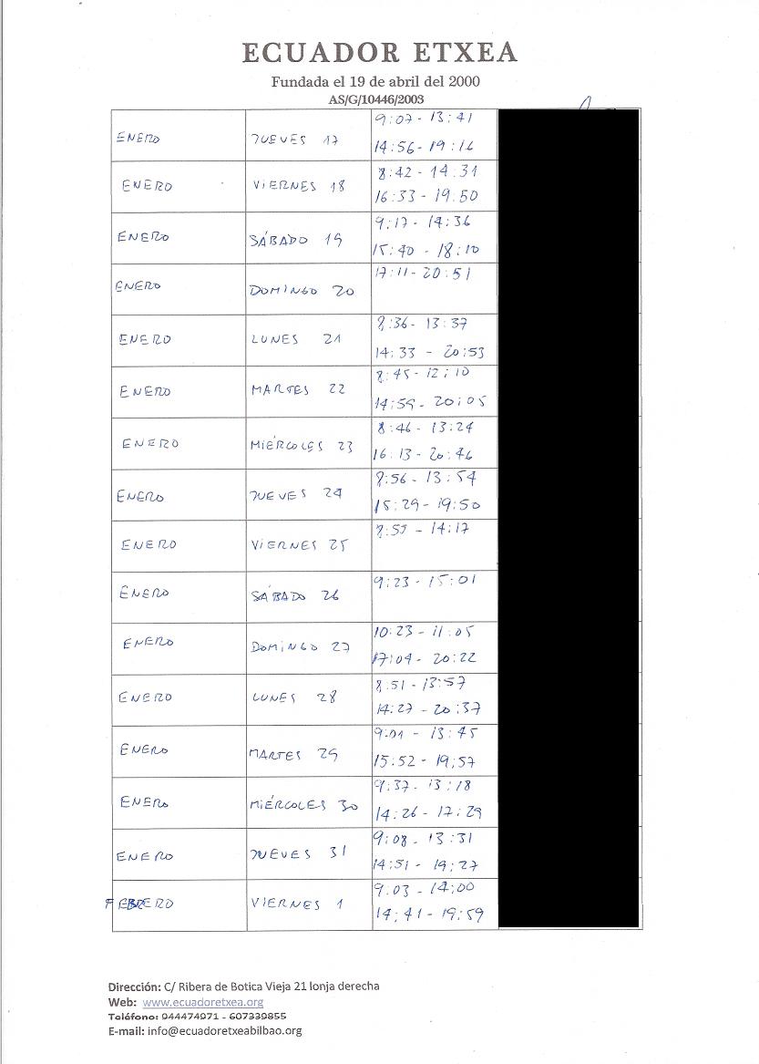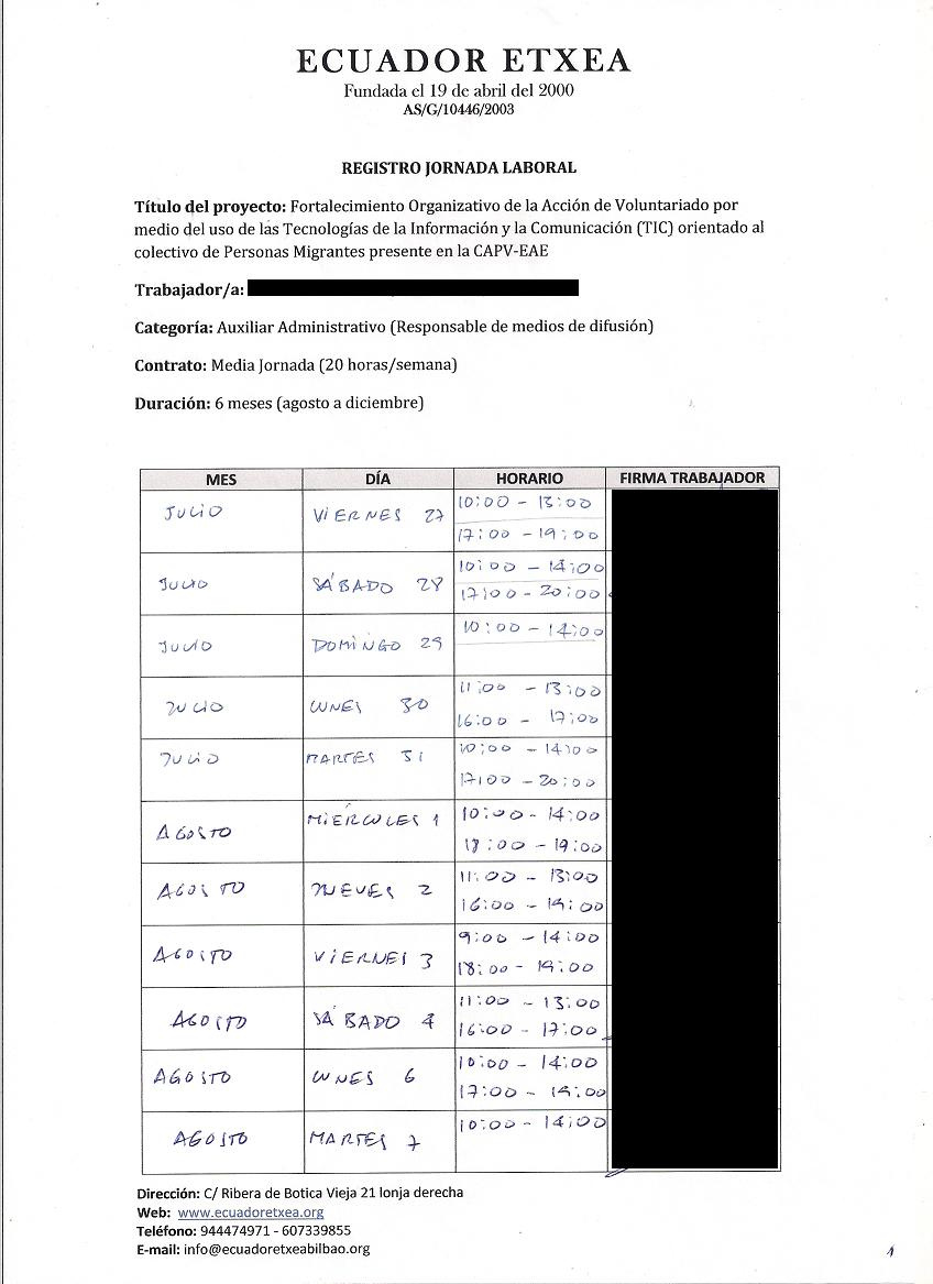 | Registro de los días trabajados (hora de entrada y salida). |
