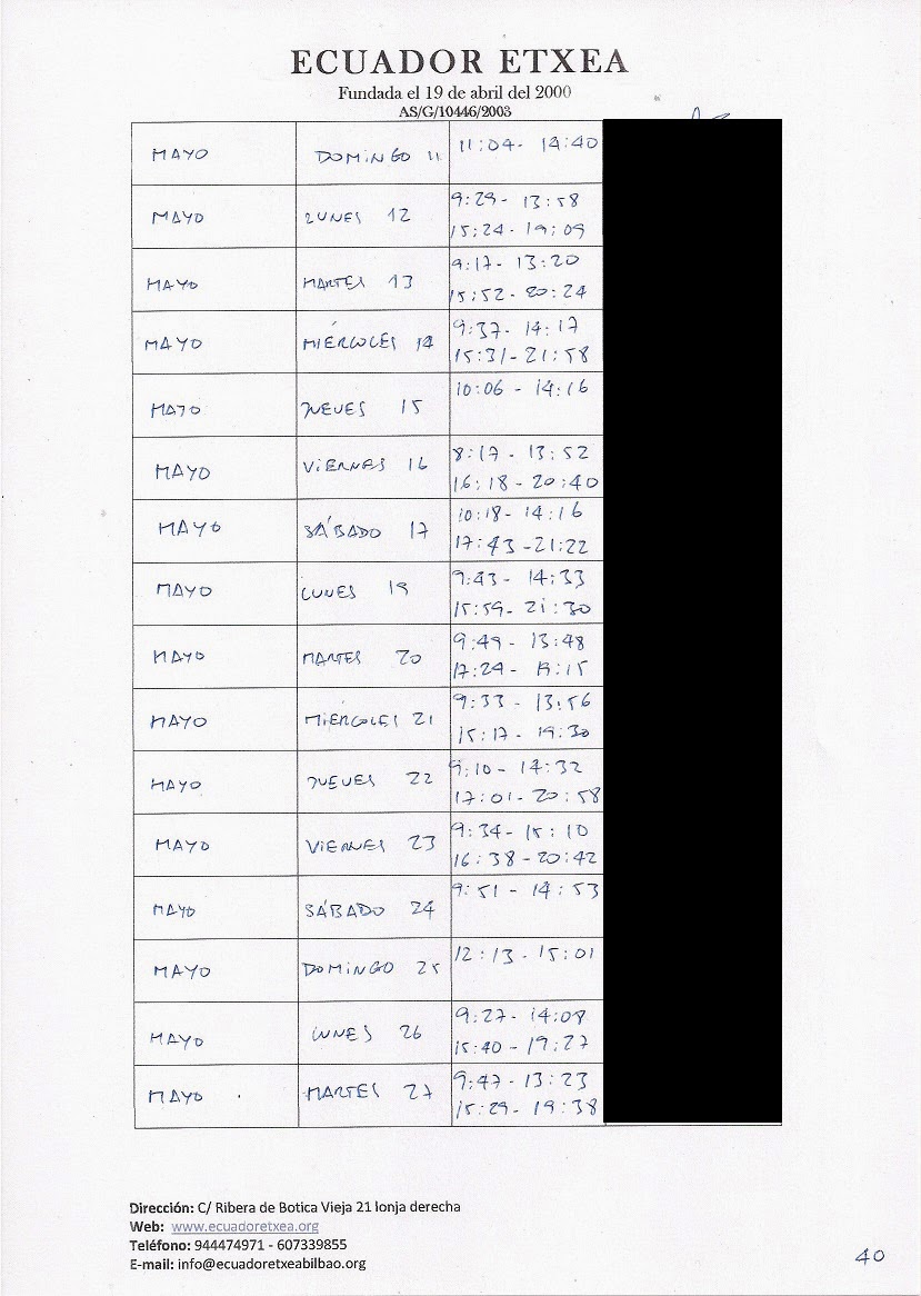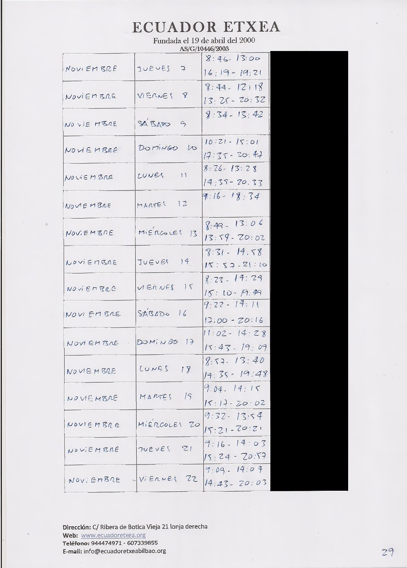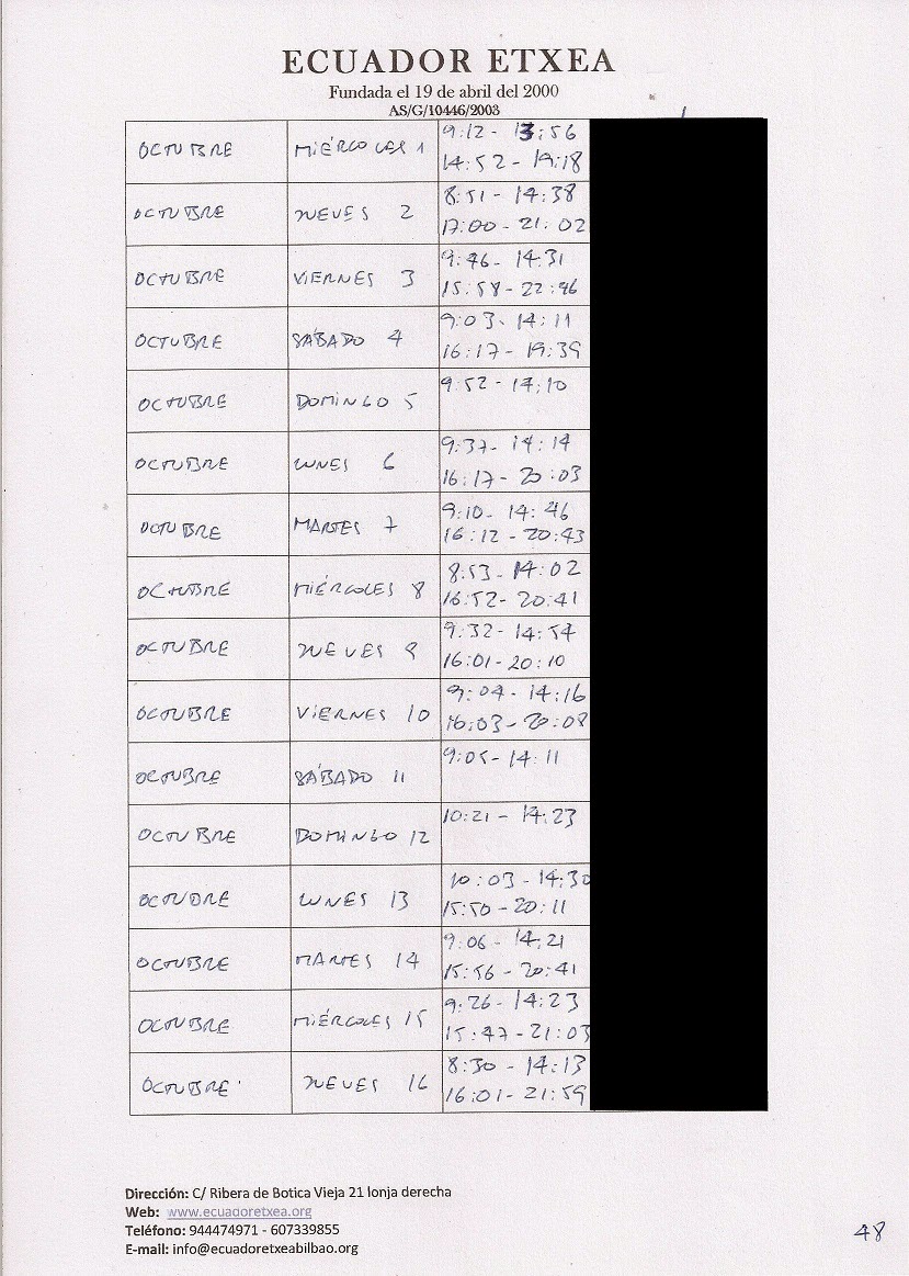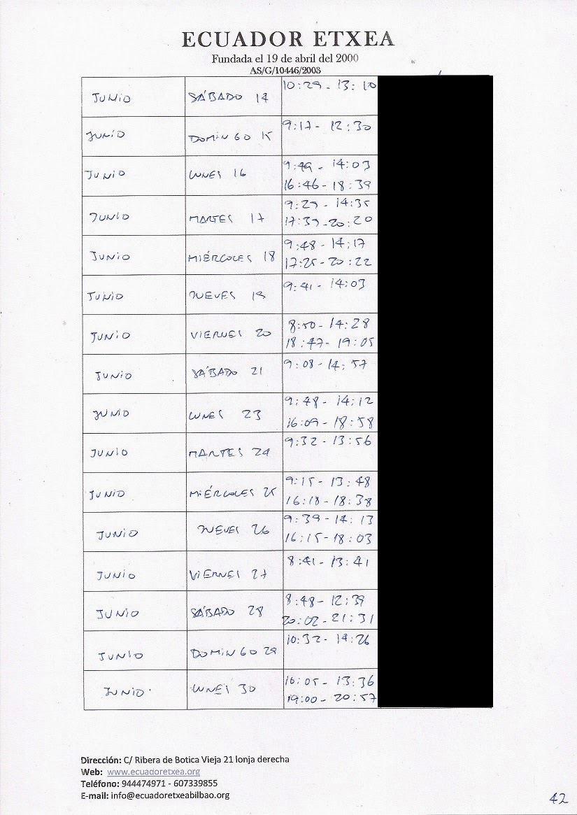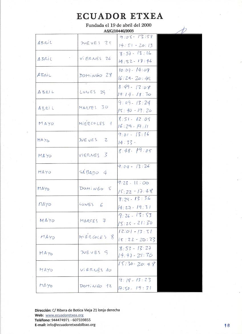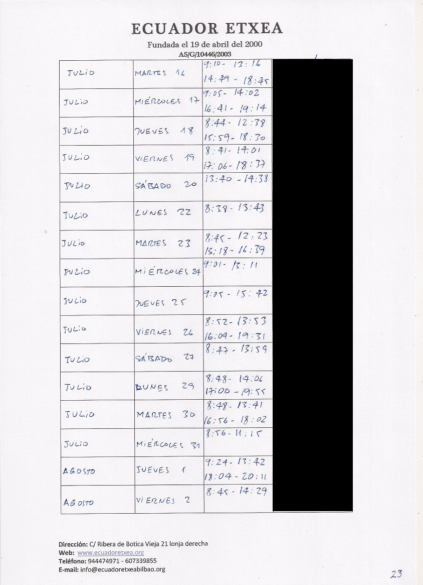 | Registro de los días trabajados (hora de entrada y salida). |