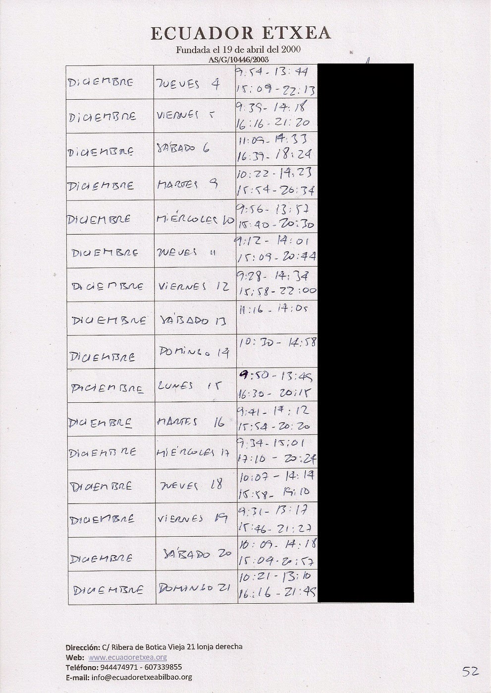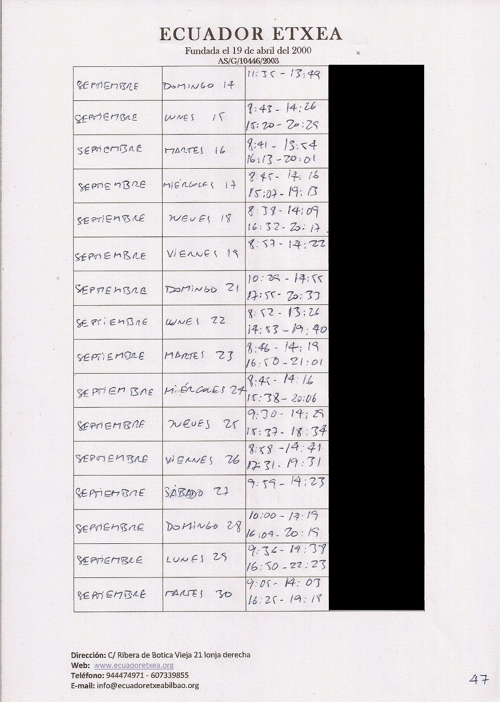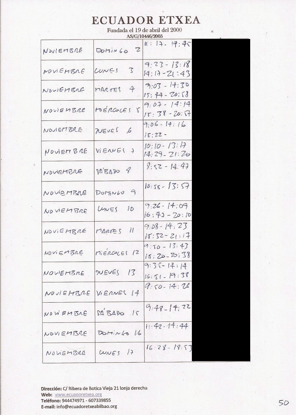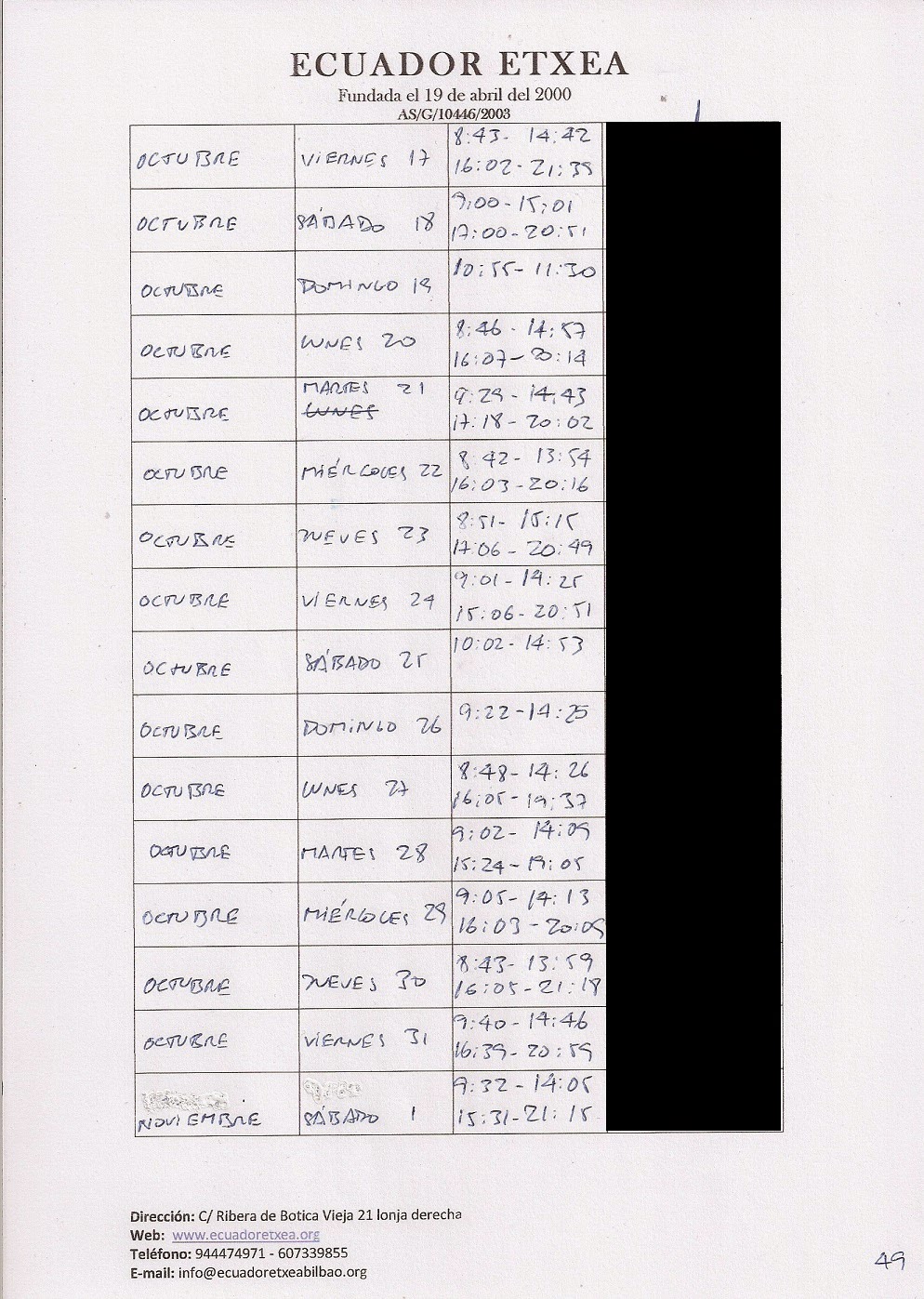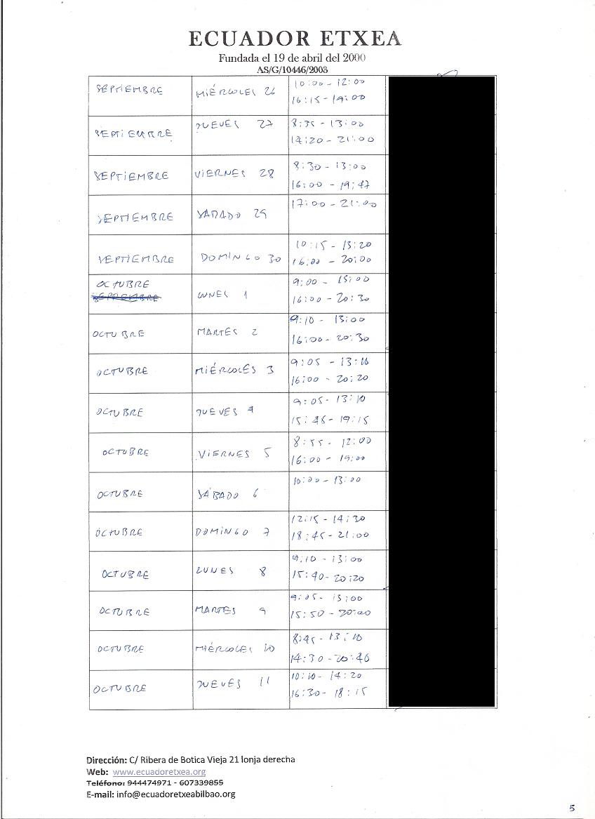 | Registro de los días trabajados (hora de entrada y salida). |