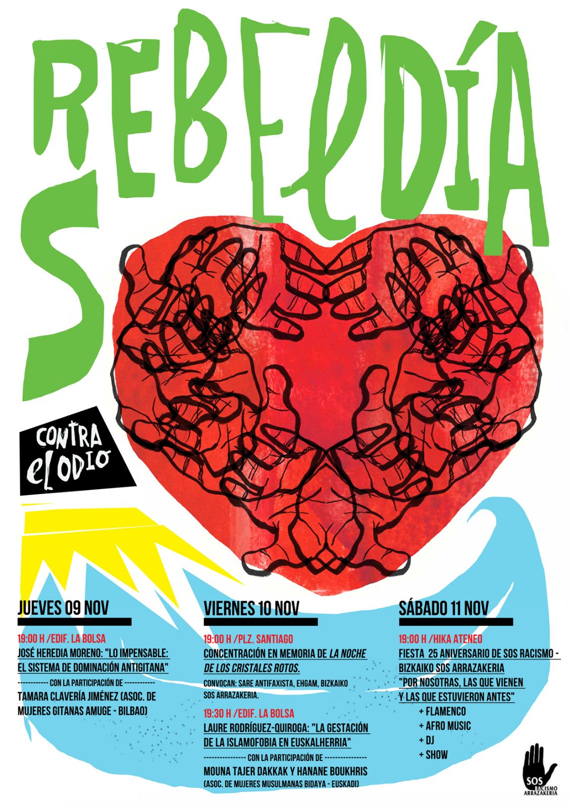 Los días 9 y 10 de noviembre, organizadas por SOS Racismo – Bizkaiko SOS Arrazakeria se celebran las jornadas “Rebeldías contra el odio” para denunciar la discriminación que sufren algunas de las minorías étnicas que residen a nuestro lado. En una situación como la actual en la que se siguen produciendo incidentes contra la comunidad gitana o las personas musulmanas y que se ven, además, sometidas a controles por su pertenencia a una minoría étnica o su origen inmigrante, se celebra este encuentro sobre antigitanismo e islamofobia para abordar discriminaciones cotidianas que afectan de manera especial a las mujeres.
