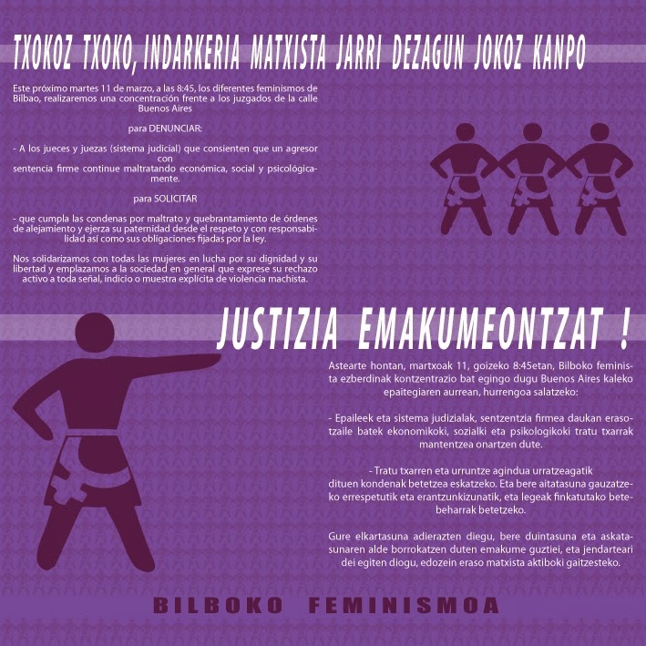 Este próximo martes, 11 de Marzo a las 9.00 los diferentes feminismos de Bilbao, realizaremos una concentración frente a los juzgados de la calle Buenos Aires para DENUNCIAR: