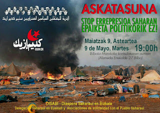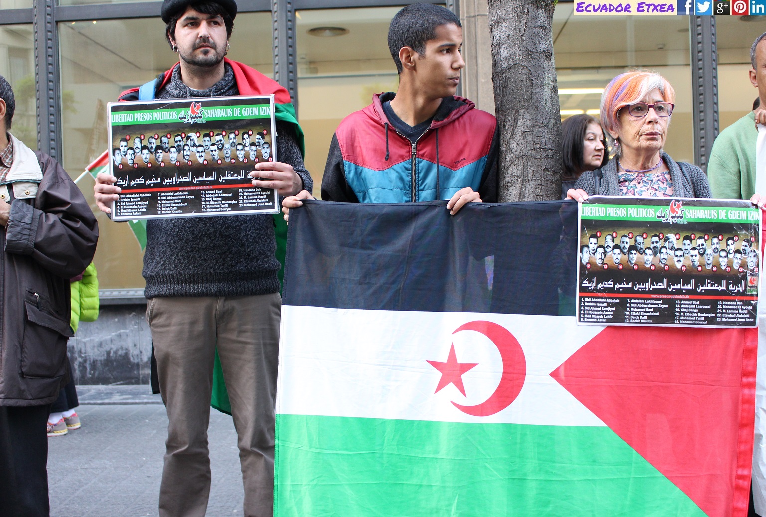 Este martes 9 de mayo frente al Consulado de Marruecos (Alameda Rekalde, 27) en Bilbao, la Diáspora Saharahui en Bizkaia (DISABI), la Delegación Saharahui en Euskadi y asociaciones de solidaridad con el Pueblo Saharahui han realizado una concentración para denunciar la reanudación en Rabat (Marruecos) del juicio iniciado contra 24 activistas saharauis detenidos (Gdeim Izik) y encarcelados en 2010 tras el desmantelamiento del campamento de la dignidad de Gdeim Izik.