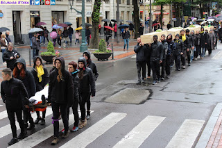 La caravana “Abriendo Fronteras/Mugak Zabalduz Euskal Herria”, que ha estado recorriendo diversos puntos de la geografía vasca gracias al apoyo de la Plataforma Ongi Etorri Errefuxiatuak, reclama la responsabilidad de las instituciones locales en el mantenimiento de las políticas migratorias europeas, y efectuado esta mañana parte de su recorrido por Bilbao en una marcha fúnebre en la que las personas participantes han llevado a hombros hasta la entrada de la Oficina de Extranjería, ataúdes que han sido depositados allí mismo, para denunciar el racismo institucional en forma de ley de extranjería como práctica cotidiana.