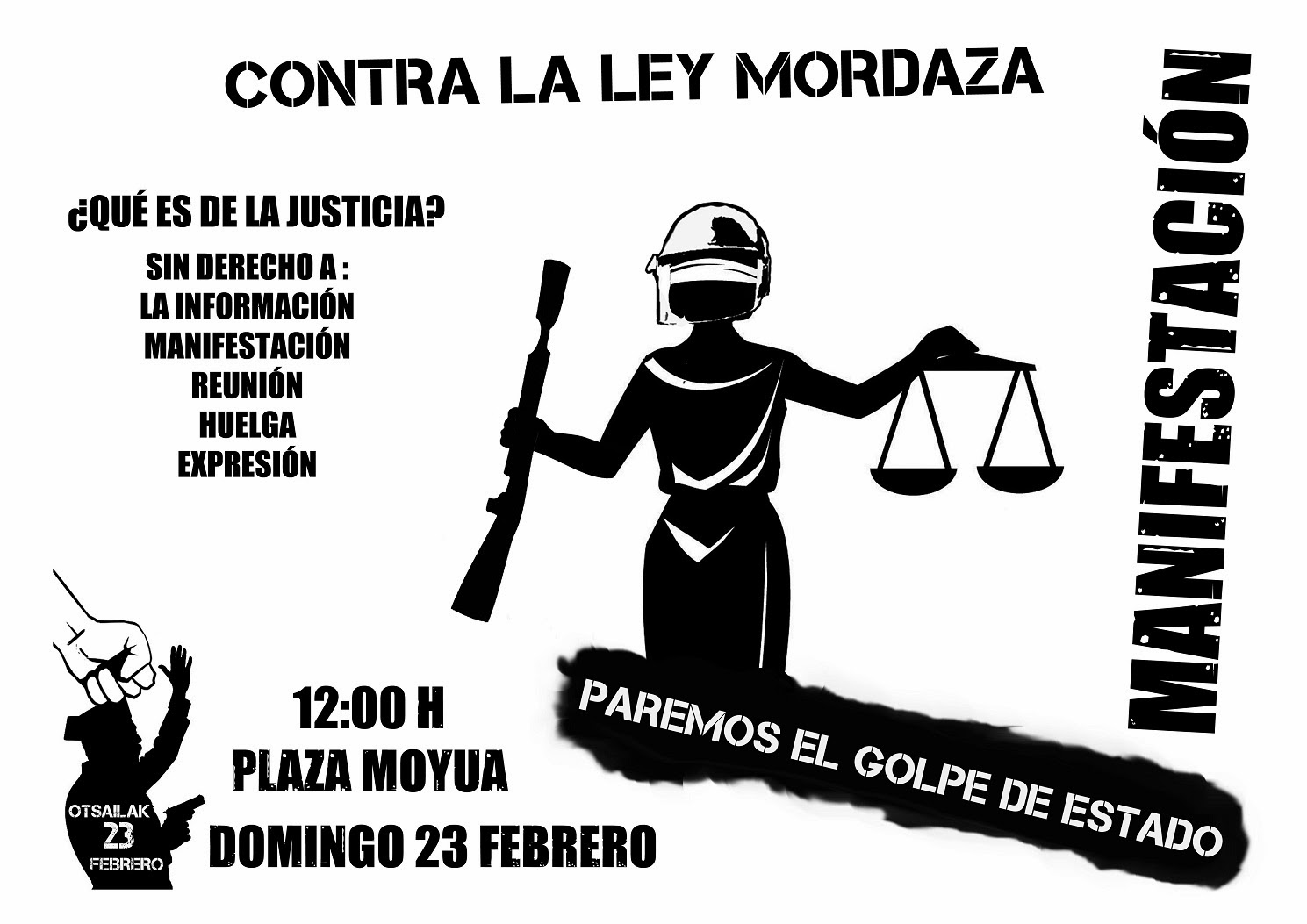 29 Organizaciones sociales, políticas y sindicales de Bizkaia y Cantabria hemos convocado una Manifestación el Domingo 23 de Febrero, que partirá de la Plaza Moyua de Bilbao a las 12:00 h. en denuncia de la reforma de la Ley de Seguridad Ciudadana y del Código Penal, que restringen libertades de la ciudadanía y, al mismo tiempo, criminaliza la protesta. Tratan de legitimar la represión, recortando los derechos fundamentales de manifestación, reunión, opinión, información y huelga, lo que supone un estado de excepción permanente. Quieren ampliar la relación de delitos a los repertorios de lucha utilizados por los movimientos sociales en los últimos años: la paralización de desahucios, la ocupación de sucursales bancarias, las sentadas, la difusión de convocatorias por redes sociales, la solidaridad con las personas migrantes , etc. Estas acciones podrán ser definidas como atentados contra la autoridad. No es un endurecimiento más, sino un cambio cualitativo. La mera palabra del policía será suficiente como prueba de cargo, será Juez y parte. Si además se quiere recurrir la sanción a posteriori en un juzgado, habrá que pagar las nuevas tarifas de la Ley de Tasas Judiciales aprobada hace un año. Se obstaculiza de esta forma la apelación a la justicia, por lo que estaremos en una situación “muy cercana” a la indefensión y la arbitrariedad.
