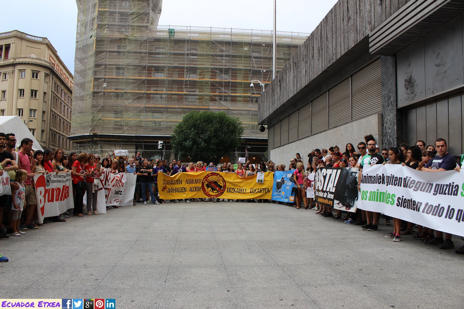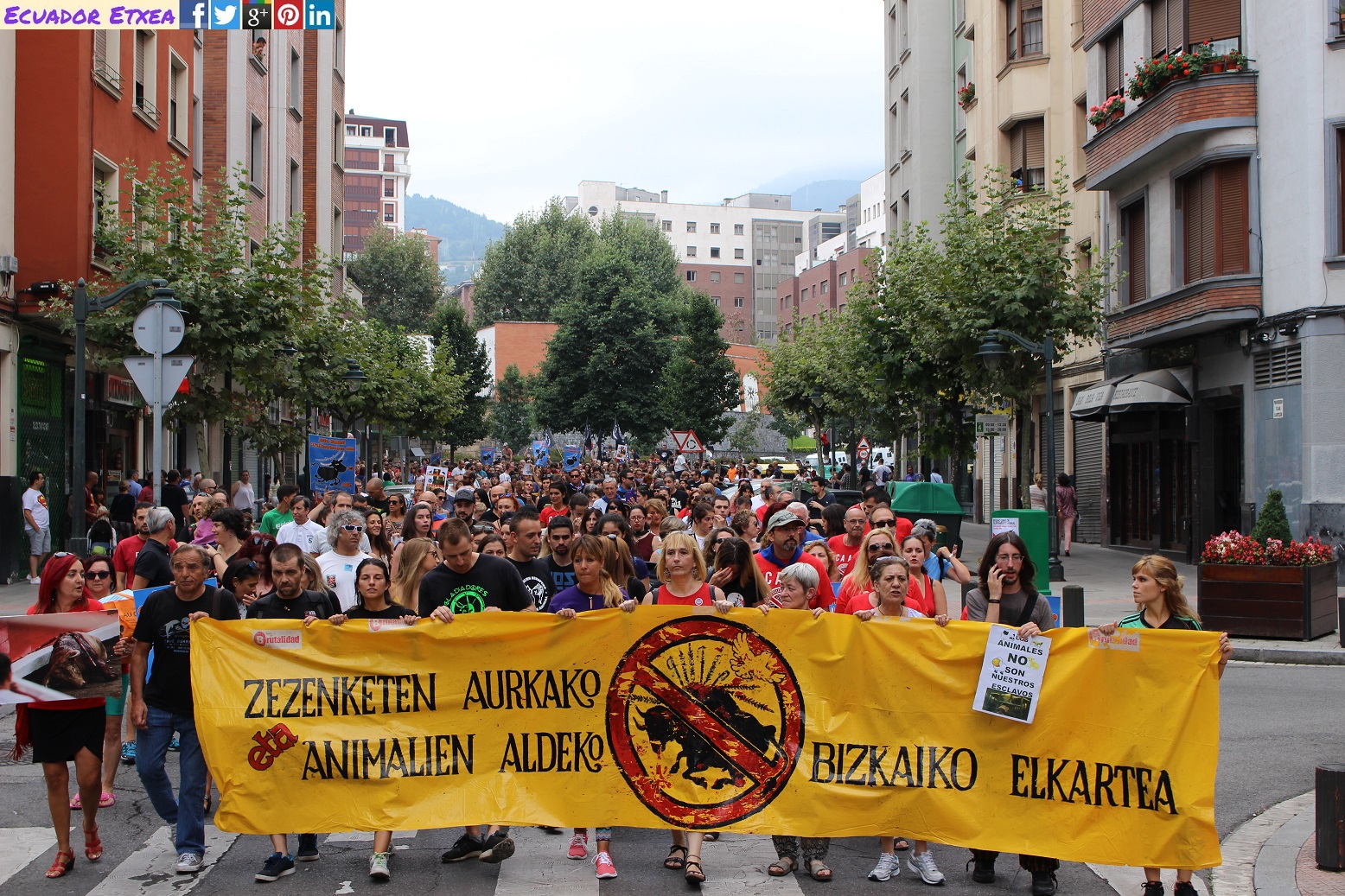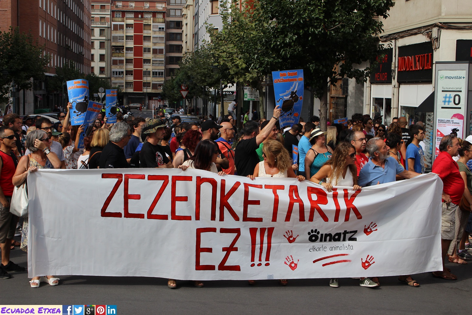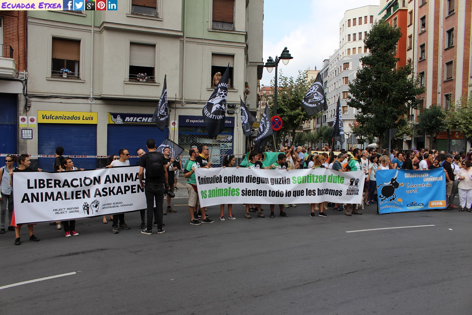 La concentración y posterior manifestación se realizó a las 17,00h. en la plaza del Arbol (plaza de Ametzola) frente a la puerta principal de la plaza de torturas y recorreremos las principales calles de la ciudad unidos frente al maltrato animal.