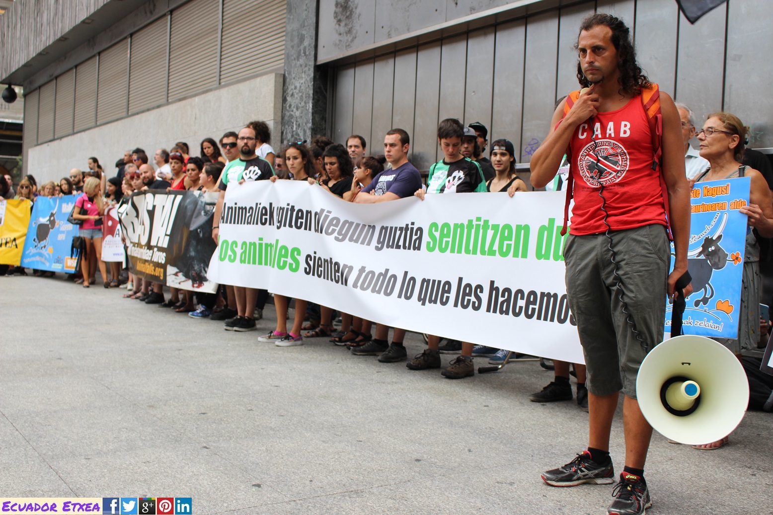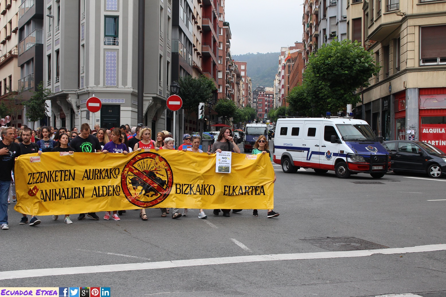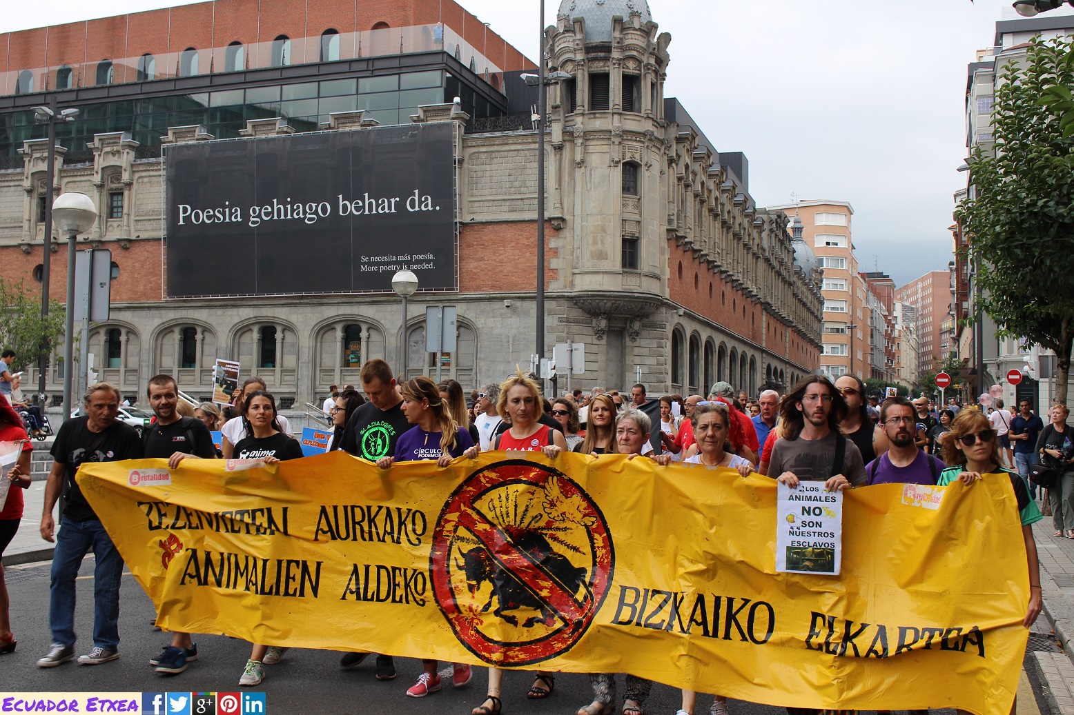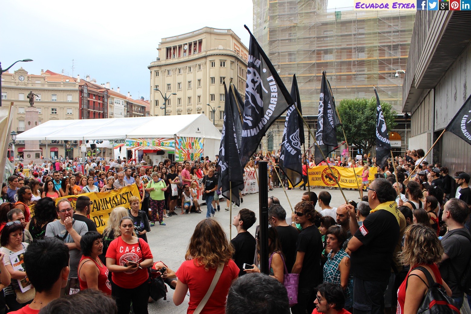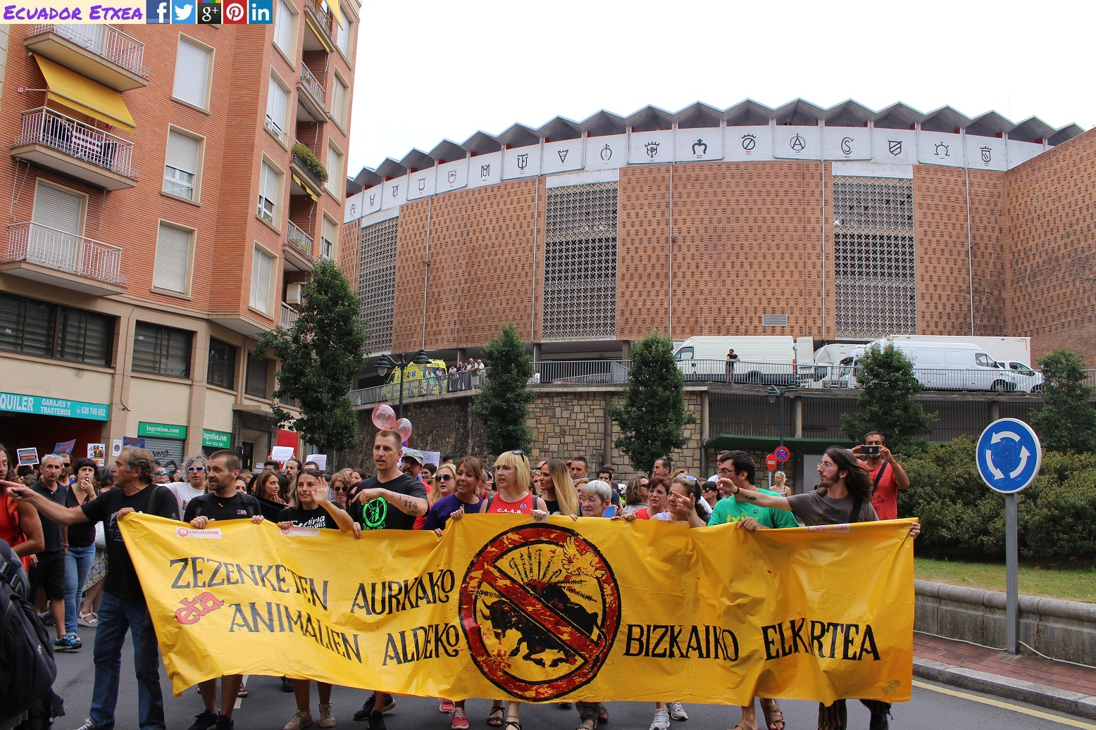 La concentración y posterior manifestación se realizó a las 17,00h. en la plaza del Arbol (plaza de Ametzola) frente a la puerta principal de la plaza de torturas y recorreremos las principales calles de la ciudad unidos frente al maltrato animal.
