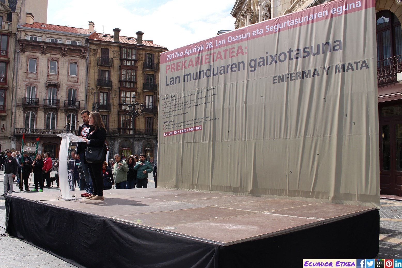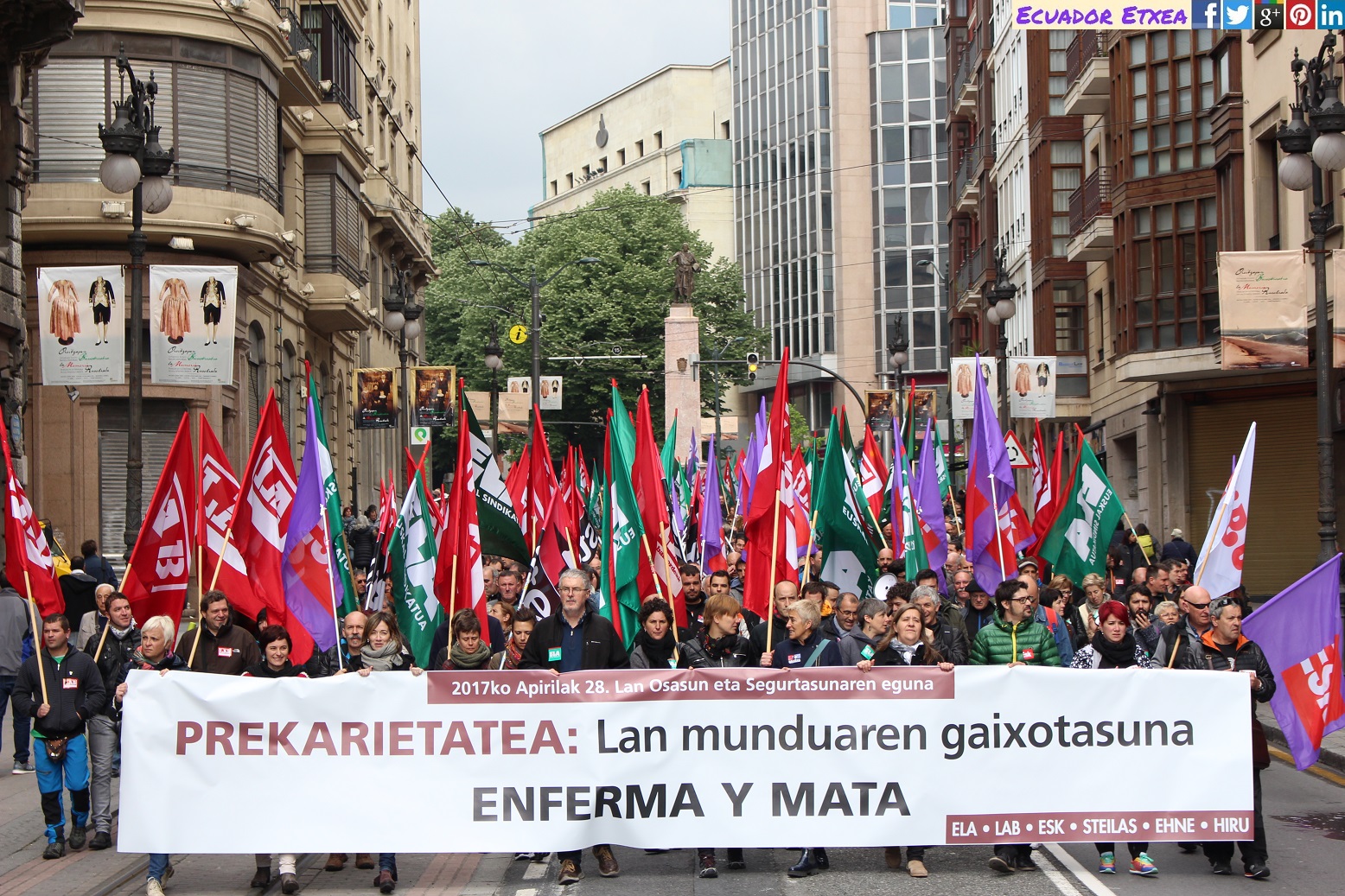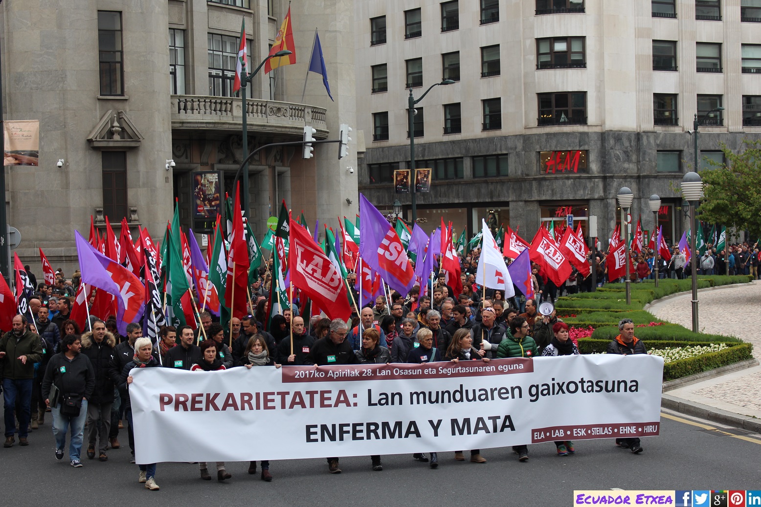 Este viernes 28 de abril en Bilbao, los sindicatos ELA, LAB, ESK, Steilas, EHNE e Hiru han realizado una movilización bajo el nombre de «precariedad que mata y enferma» con motivo del Día Internacional de la Seguridad y la Salud en el Trabajo.