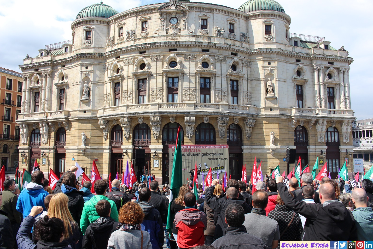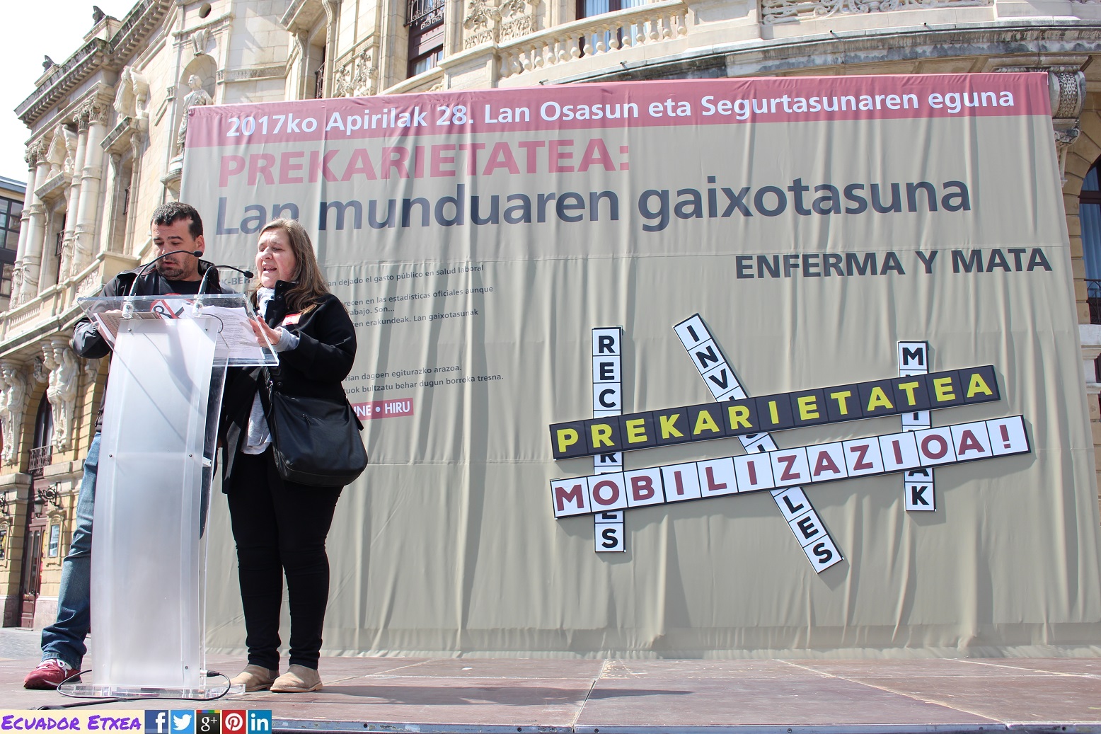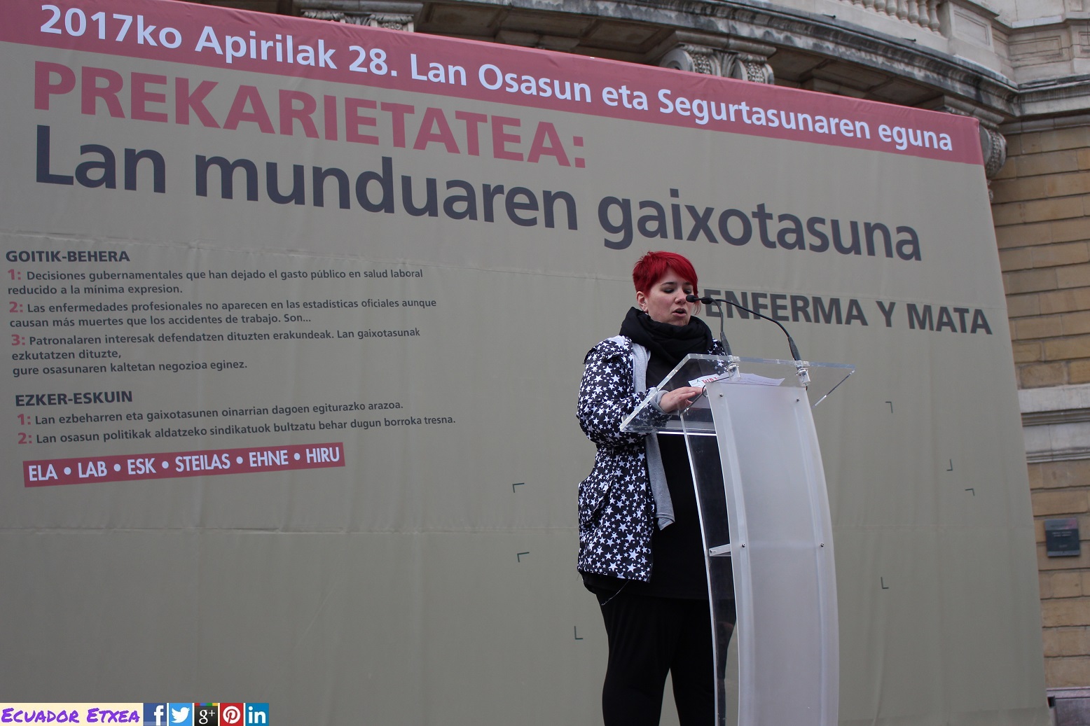Este viernes 28 de abril en Bilbao, los sindicatos ELA, LAB, ESK, Steilas, EHNE e Hiru han realizado una movilización bajo el nombre de «precariedad que mata y enferma» con motivo del Día Internacional de la Seguridad y la Salud en el Trabajo.