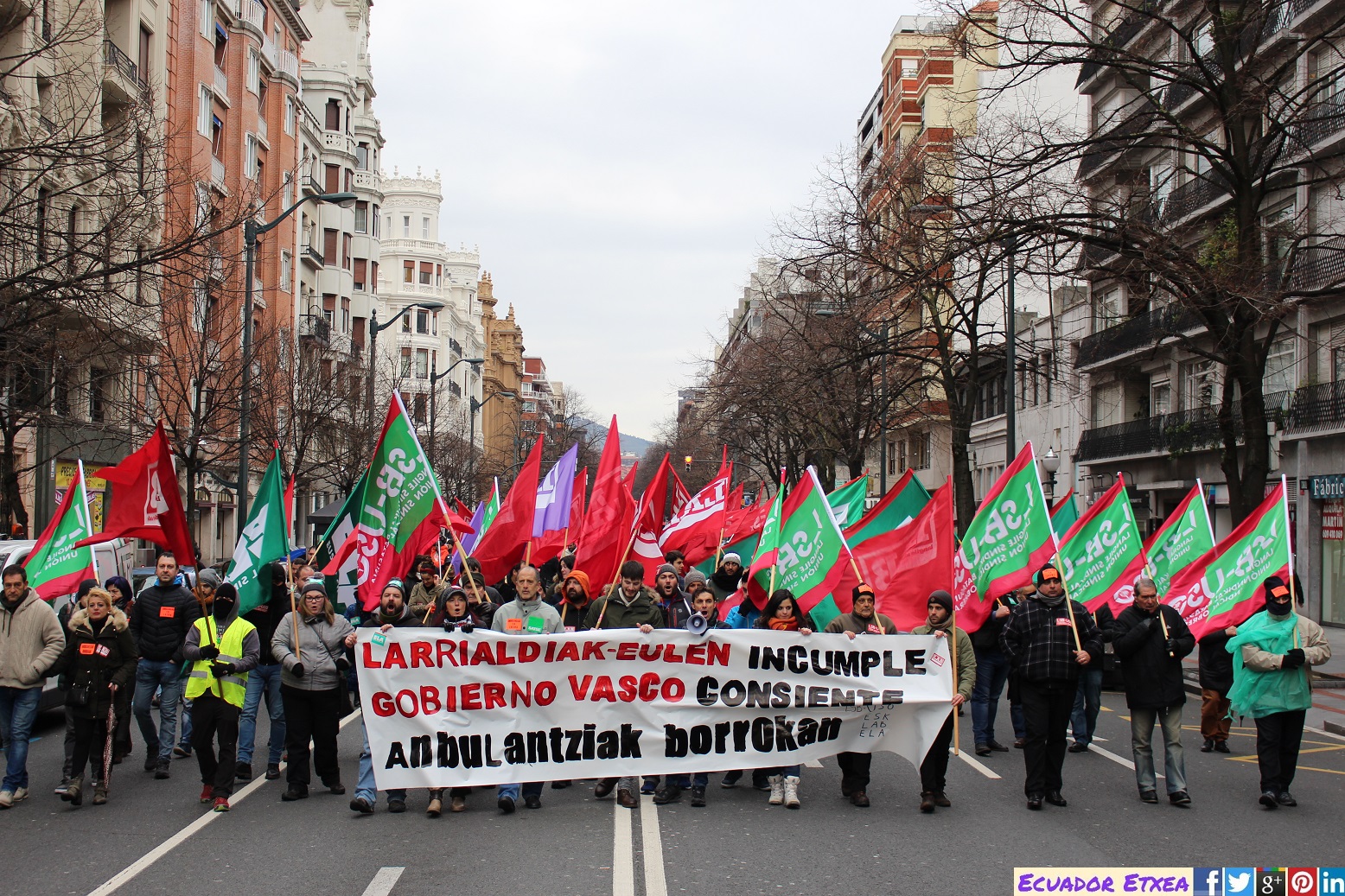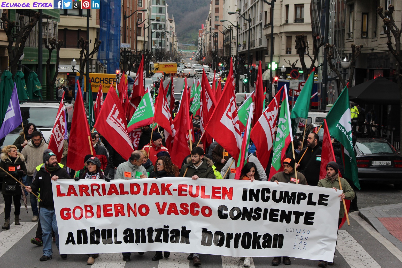 El comité en bloque, formado por LSB-USO, ESK, ELA y LAB, ha realizado una manifestación este miércoles 18 de enero a las 11:00 de la mañana desde la sede del Departamento de Salud (Alda. Rekalde) y ha finalizado en la sede principal del Gobierno de Gasteiz (Gran Vía 85) de Bilbo para denunciar «la existencia de una importante serie de conflictos graves provocados por la UTE conformada por las empresas Larrialdiak – Eulen, concesionaria del servicio de ambulancias de la Red de Transporte Sanitario de Urgencia del 112 SOS DEIAK y Emergencias Osakidetza».