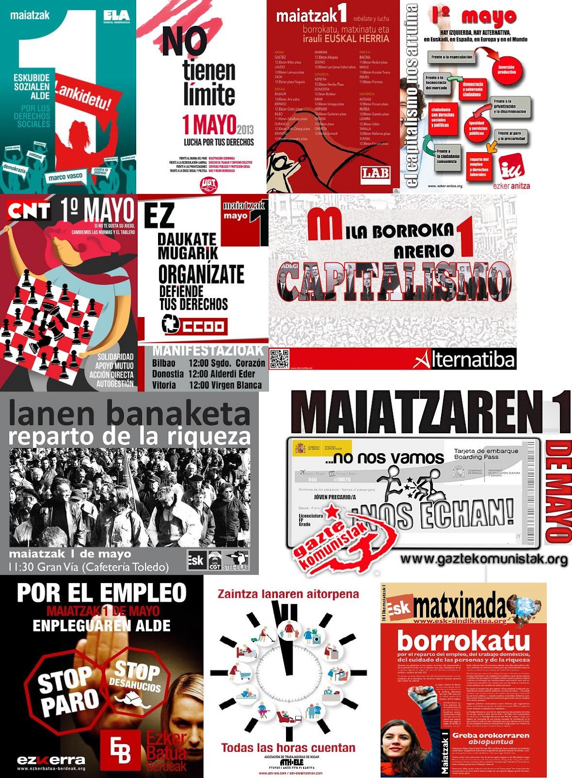 Los sindicatos vascos han apelado a la clase trabajadora y a la sociedad, en general, a salir a la calle hoy, 1 de mayo, pararechazar los recortes y exigir que se pongan en marcha otras políticas para hacer frente a la crisis. CC.OO. y UGT realizan una convocatoria conjunta, mientras que ELA y LAB, al igual que el pasado año, se movilizarán por separado.