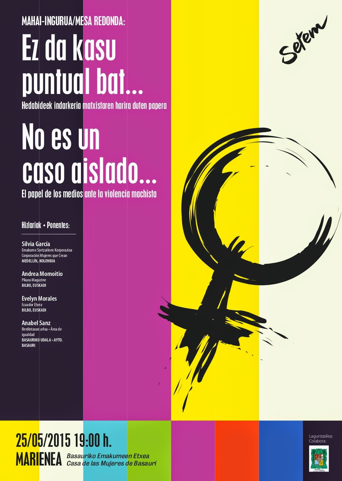 Desde SETEM Hego Haizea queremos invitaros al conversatorio “No es un caso aislado…” El papel de los medios ante la violencia machista. Contaremos con la participación de Silvia García directora de la corporación Mujeres que Crean de Medellín, Colombia; así como con Andrea Momoitio de Pikara Magazine, Evelyn Morales de Ecuador Etxea y Anabel Sanz, técnica de Igualdad del Ayuntamiento de Basauri.