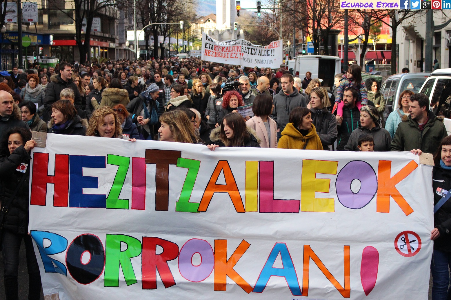 Han sido miles las trabajadoras y trabajadores que hoy han participado en las movilizaciones. Han exigido el incremento de la inversión, de las plantillas y los recursos en educación, la reducción de las inaceptables tasas de temporalidad y del número de alumnos y alumnas por aula, así como el fin de los recortes impuestos en salarios, sustituciones, bajas, jubilación y resto de condiciones laborales. Han reivindicado el desarrollo de un modelo de inmersión en euskera que permita un alumnado euskaldun y plurilingue, así como que se dejen a un lado la LOMCE, Heziberri y la mercantilización de la enseñanza, y que la educación sea un instrumento para garantizar la equidad, la justicia social, la integración y la cohesión en la sociedad.