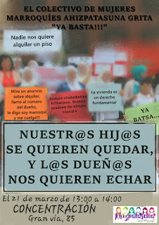 Integrantes del colectivo de mujeres marroquíes de “Ahizpatasuna” han llevado a cabo una segunda movilización, esta vez frente a la sede del Gobierno Vasco en Bilbao (Gran Vía 85) para denunciar que nadie les quiere alquilar un piso solo por el hecho de ser marroquíes. Señalan que se trata de una doble discriminación que sufren tanto ellas como sus hijos e hijas.