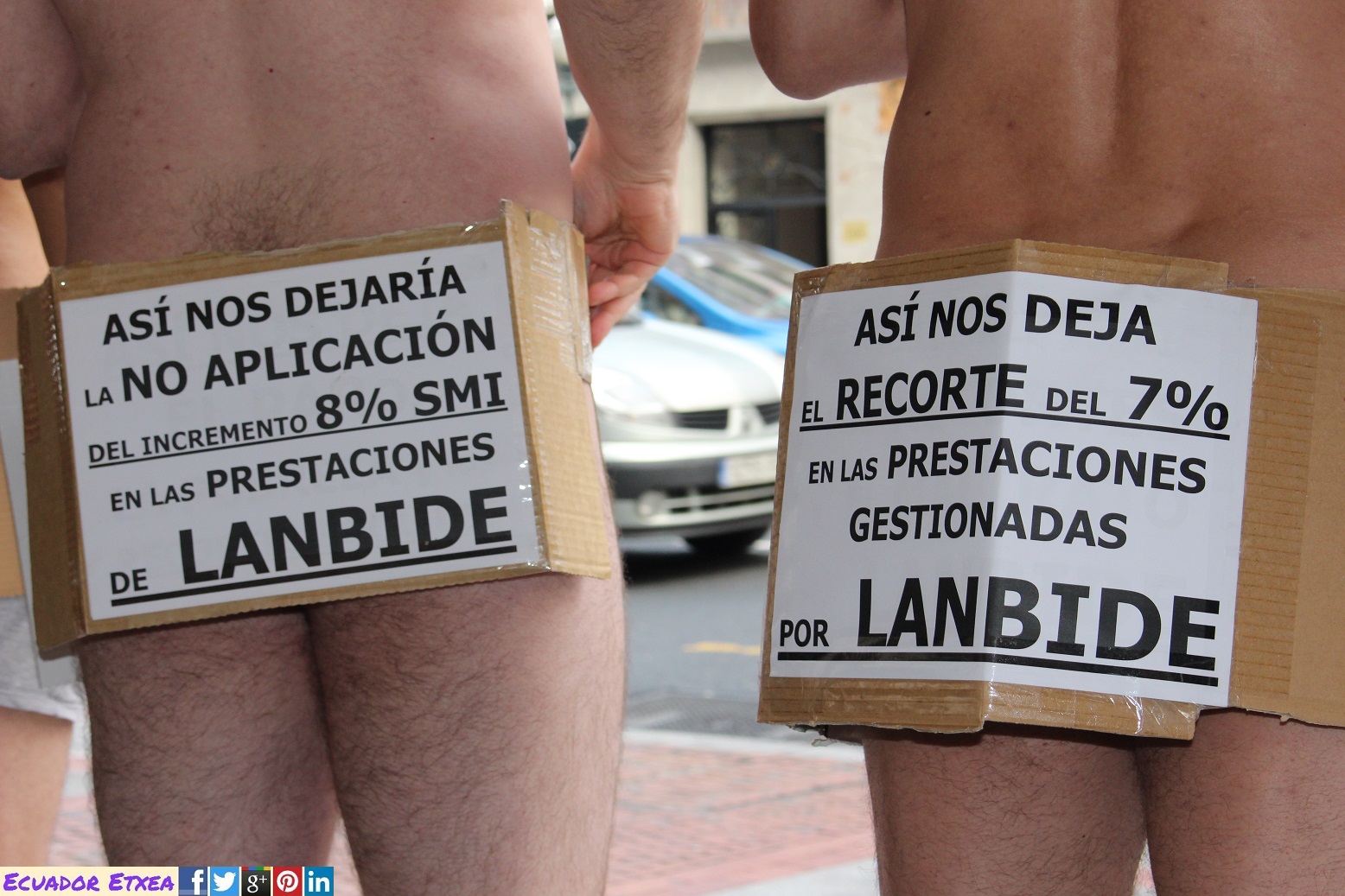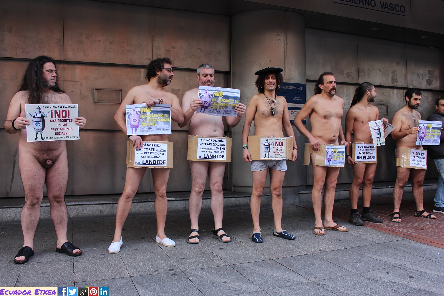 Con el ánimo de visualizar los recortes contemplados desde el Gobierno Vasco. Media docena de personas han marchado en paños menores –y cubiertas con tan sólo una caja de cartón- desde la Delegación del Gobierno Vasco hasta las oficinas centrales de Lanbide, para denunciar que el Gobierno Vasco, incumpliendo la ley, nos quiere recortar el 15% de la RGI.