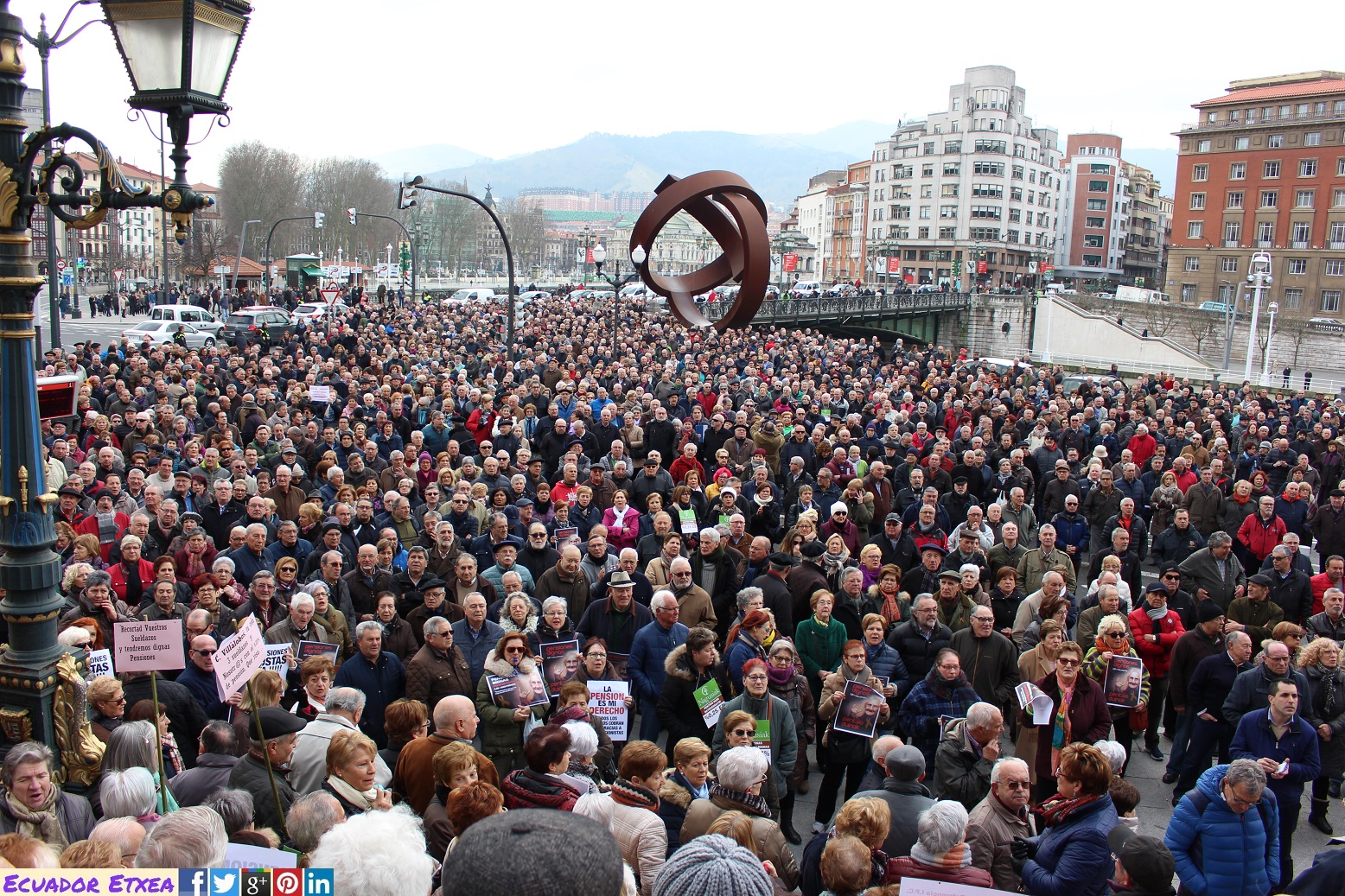 Como viene siendo habitual desde el pasado mes de enero, este lunes 26 de febrero, cientos de personas jubiladas, pensionistas y viudas se han congregado frente al Ayuntamiento de Bilbao convocadas por la Plataforma de Asociaciones de Jubilados de Bizkaia (PJB), para protestar contra “las pensiones de miseria” y por el incremento del 0,25% aplicado por el gobierno de estado español.