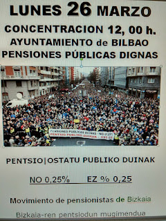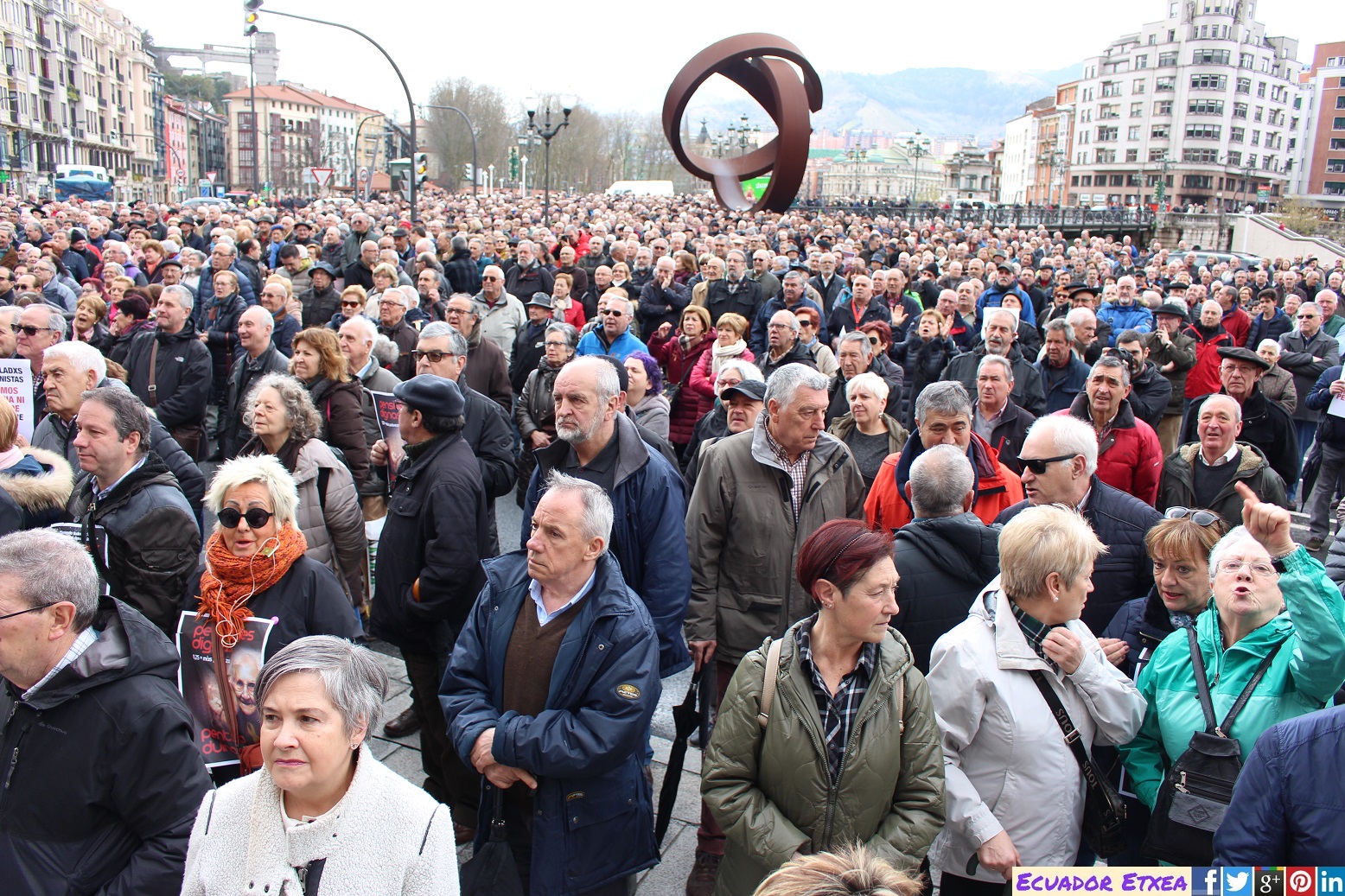 Durante la concentración, integrantes de la plataforma han realizado una valoración positiva de la histórica manifestación realizada este pasado sábado 17 de marzo en la participaron más de 100.000 personas en Bilbao, con el apoyo de agentes sindicales y sociales. Y anunciaron que el próximo lunes 2 de abril no se realizará concentración en Bilbao a causa de la semana santa, pero sin embargo, volverán a reunirse frente al consistorio bilbaíno, el lunes 9 de abril a las 12:00.